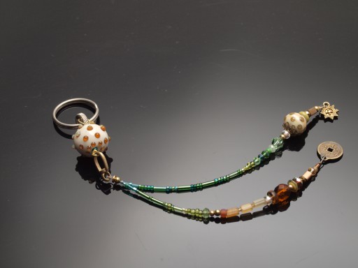 Dead mouse, 7-5/8" long (exclusive of keyring); focal bead, about 5/8x3/4" I evidently didn't make any notes about when I strung the tails or assembled the piece, but the latter, at least, happened within the last two months. Photographed, E620/zuiko 50mm macro, lumopro manual flash, f8, 1/125sec, 20apr2020