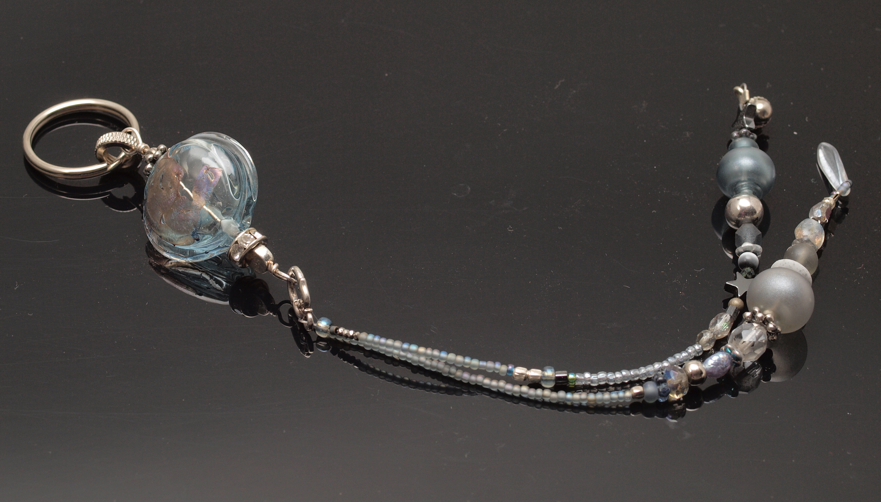 To pick up on this subtle effect, I strung the piece with a purplish blue freshwater pearl, and two grey pixie dust beads, as well as seed beads with iridescent qualities. —I must've done something right, because f2tE immediately claimed it.