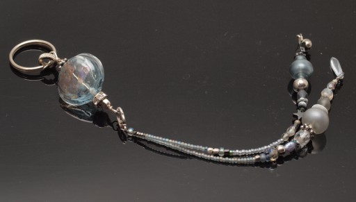 The bead is a very pale blue (or possibly alexandrite)[1] transparent with a super-fine layer of a plum shard—one so thin that not only is it effectively transparent silver purple, it has some tinges of blue as well, giving a subtle iridescence.