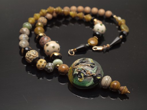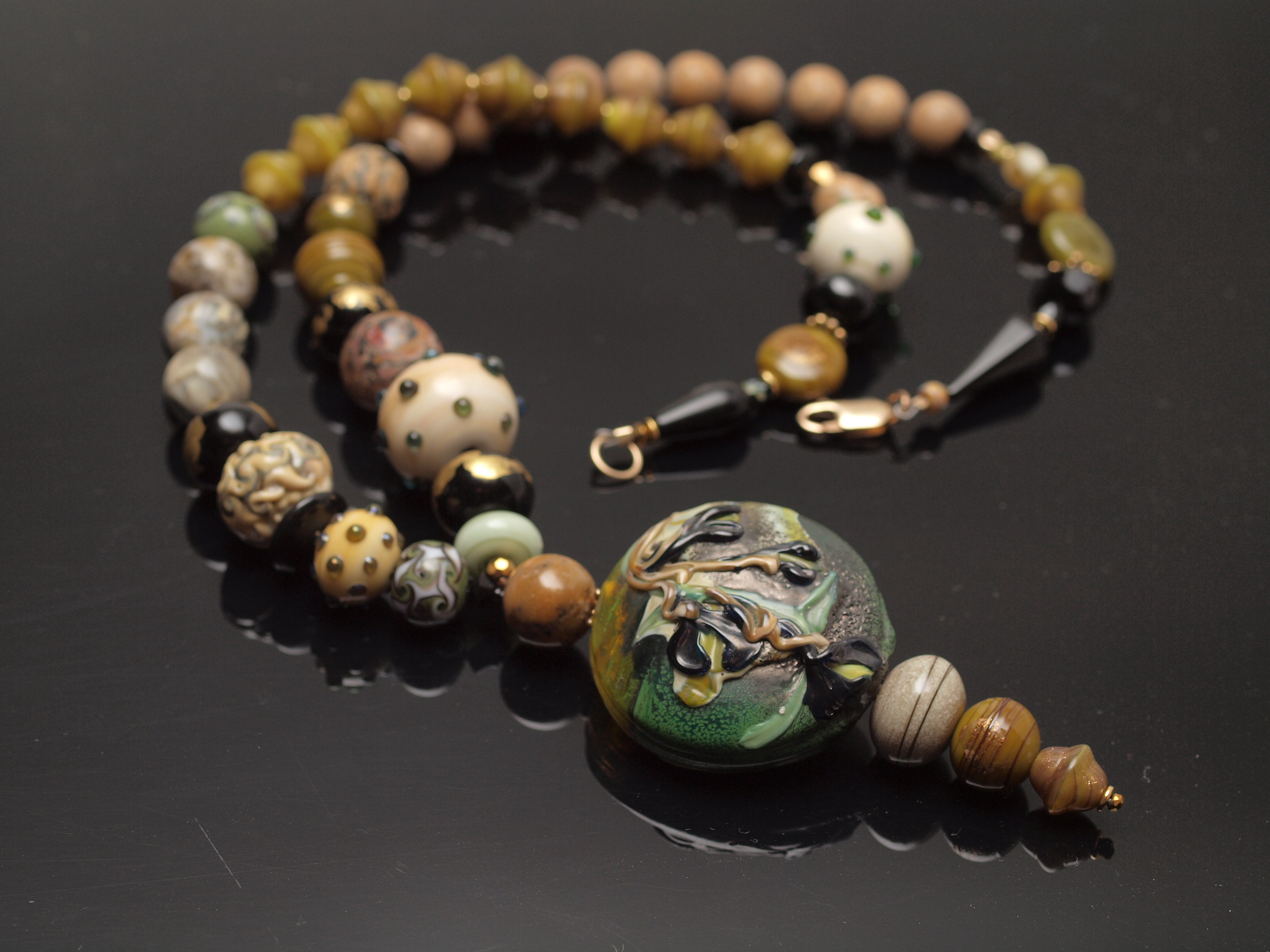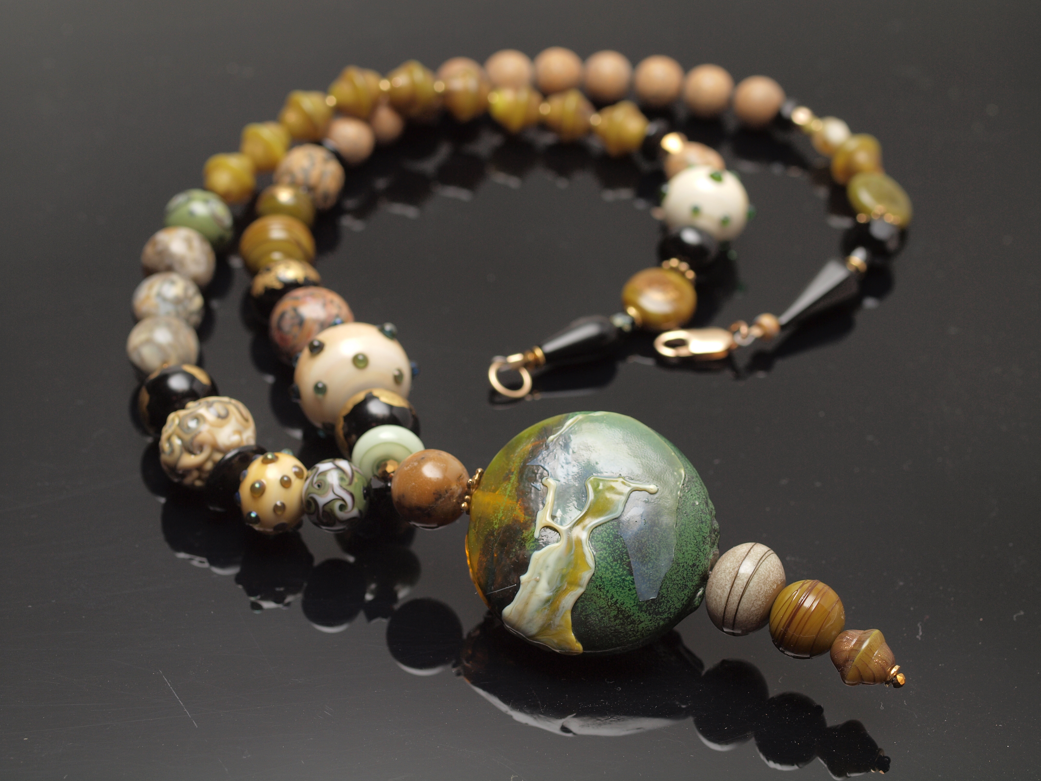 Because the colours weren't right for the design I had in mind, I was initially dissatisfied with this focal; just by designing this necklace specifically around it, it has now transformed into a ‘good’ bead.