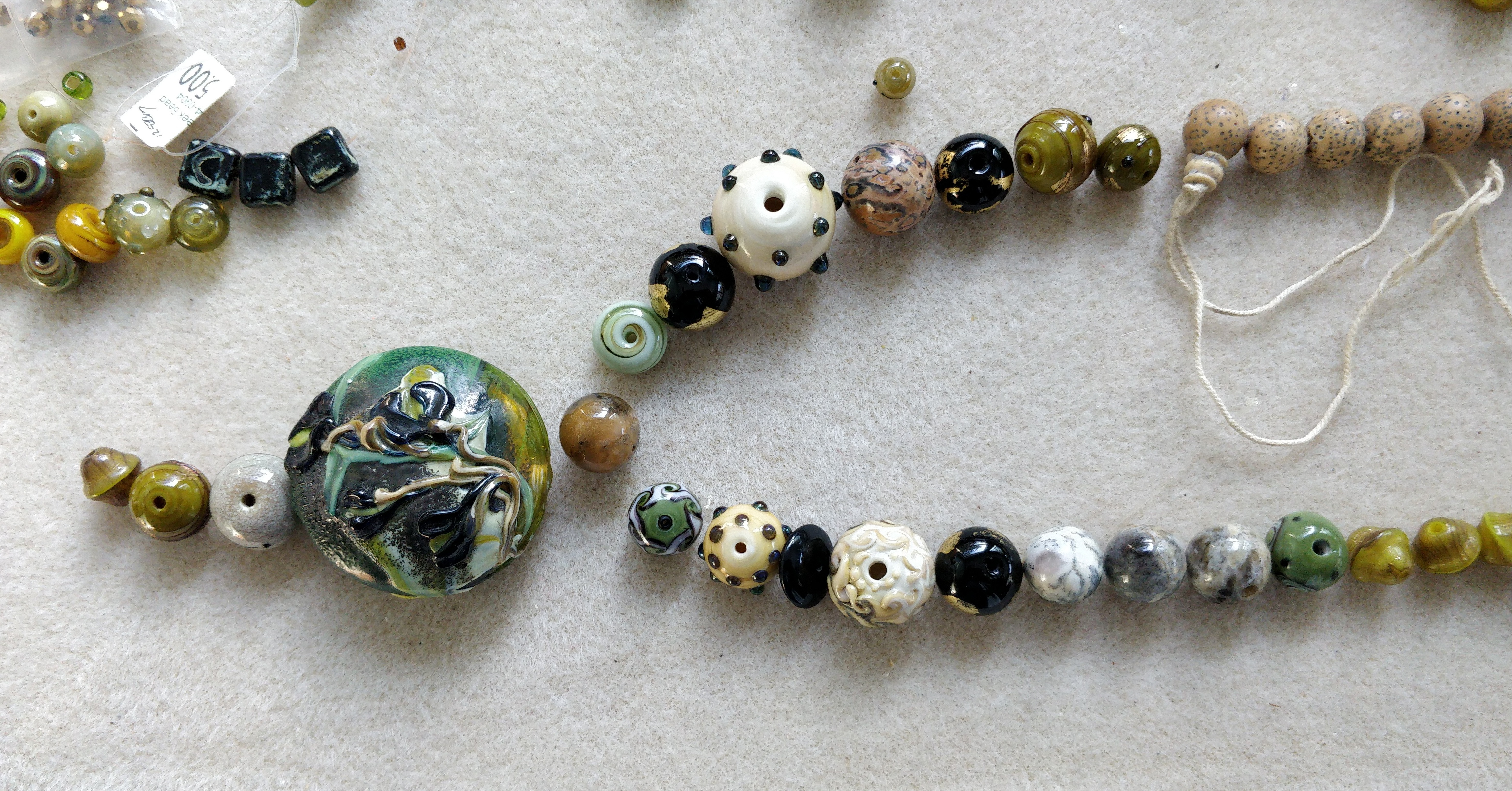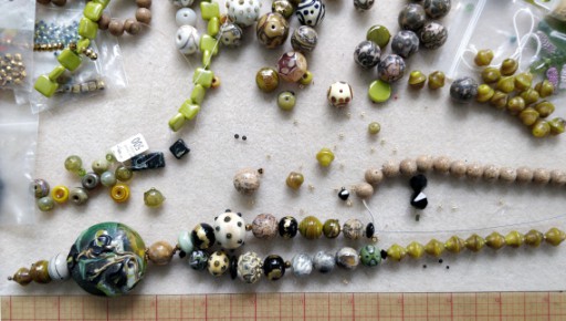 I happen to love green, particularly the colour I call ‘sour green’ —a yellow green with some brown (i.e. not full on pure hue) and a while back, I made a beadwoven spike, which I began stringing into a necklace in March 2017. It was not perfectly successful, but I liked the colorway, and by March of 2018, when I finally gotten around to posting it, I had collected a fair number of czech & seed beads beads in the colourway. I made a series of lampworked focals & matching designers, to make a really nice necklace that did work. Alas, I wasn't really happy with the lampwork; I made some mice using the smaller florals which I posted in March of 2018, but the major project continued as a tray full of beads cluttering up my studio.