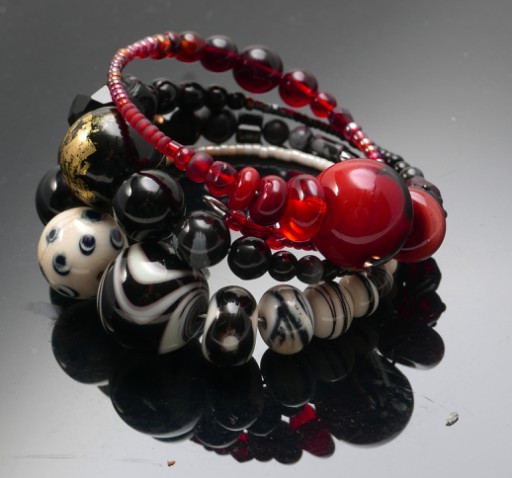 Today's memory wire bracelet is by Fran, and I really like what she did with it. —The same, alas, cannot be said of my photography, somewhat hampered by the fact that Fran didn't want finials, and I didn't want to show them missing, which made styling the piece in multiple views trickier. And it simply would not stand up sideways. Otoh, the red shadow of the disk bead nexted to the large raked lotus is pretty cool: I love that the reflections of the beads have shadows;)