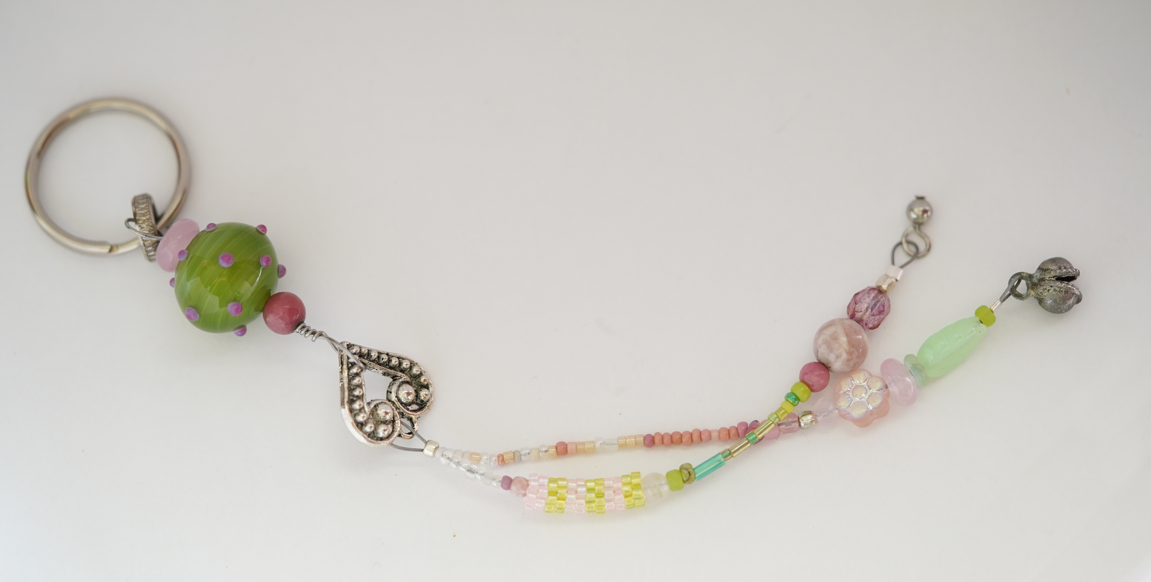 (As it happens, I think this combo, the soft pink with the acid green is the least successful of the unknown beader's combos. There's no reason why this should be so—certainly the soft, translucent pink is roughly similar to the lustre on the transparent lime, and of course the beads are exactly the same size, so the artist really only shifted the saturation, from the high-tint pink to the brighter acid green.