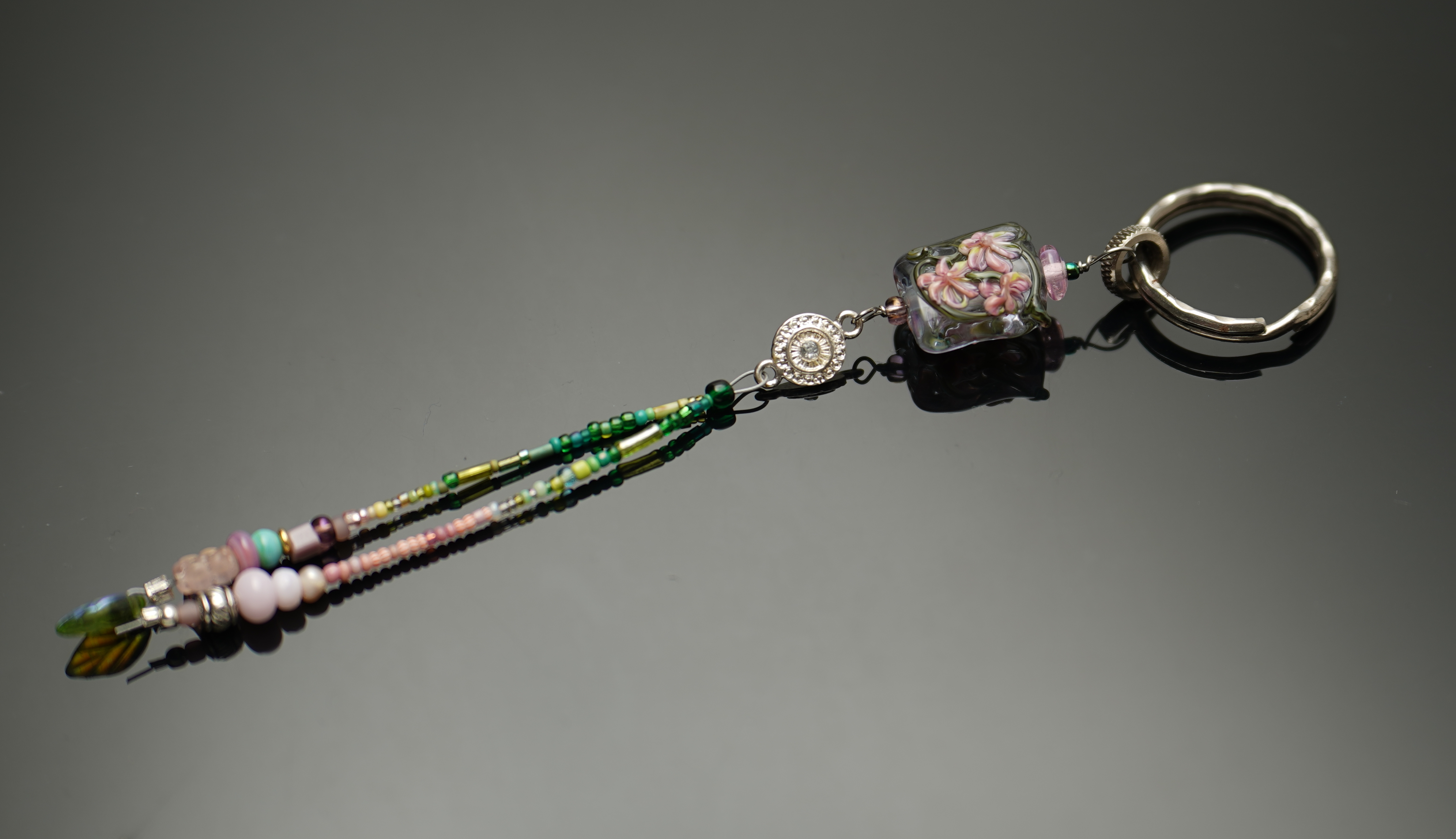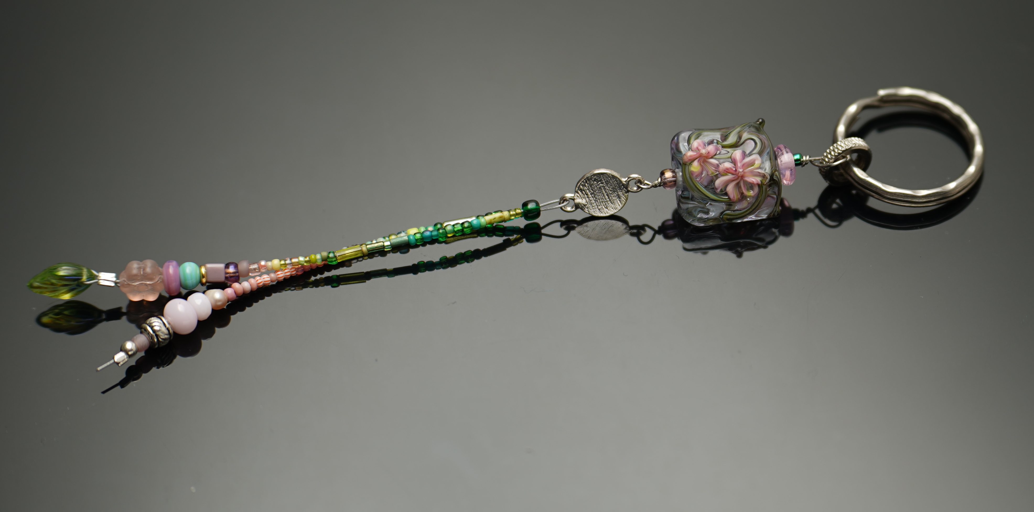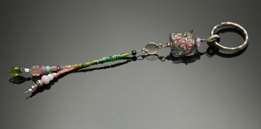 Dead mouse, focal 12x17x19mm, overall length 6-1/8"; glass, basemetal, beadalon, bicycle ring; strung & photographed 13apr22; sony A7c, tamron 70–180mm lens (at 70mm; f/2.8, ISO 50) godox TT600 flash (at either 1/16 or 1/8th power)
