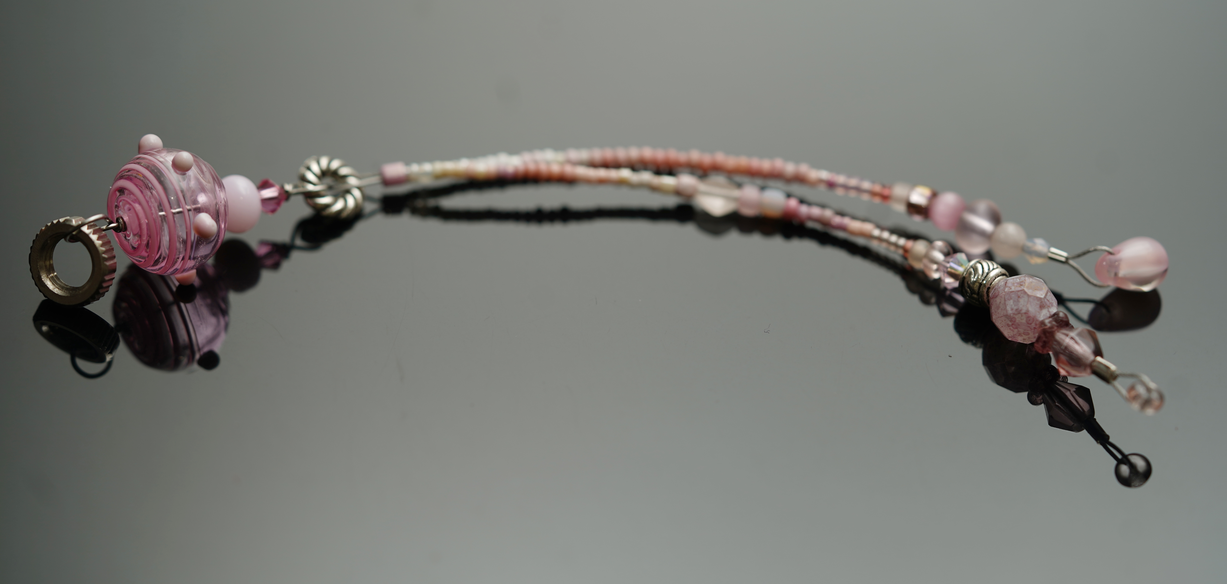pink mini mouse featuring a raked lotus filigrana and CiM half and half bead, measuring approx 11x16 (including dots); part of a mouse measuring 5-3/4"/14.5cm overall; glass, bicycle inner tube lock washer, stainless steel (308), basemetal; strung and photographed 08jul22. Sony ILCE-7C with sony 90mm macro lens, godox manual flash; f/3.5, 1/160s, ISO 50