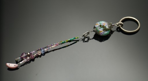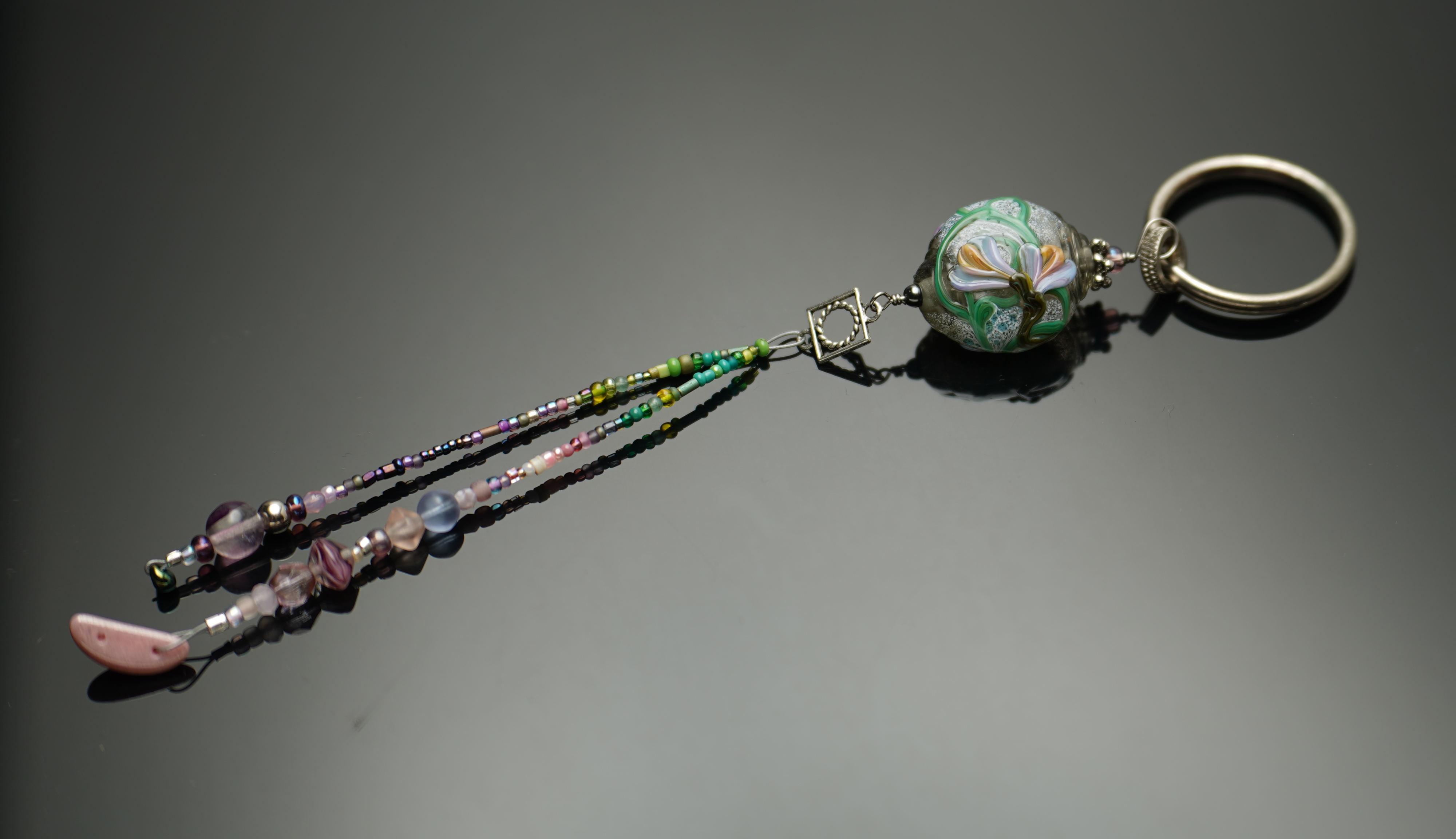 This mouse features another focal in the so-called ‘crisp floral’ series, but a later one, when I was doing very minimal abstract backgrounds—just a touch of white thompson enamel and bit of blue-green frit. (Typical abstracts generally have at least three shades of TE, and 2–3 frit combos. Here I was being a bit lazy about getting all those trays out, and just pulling 1 or 2 individual tins. Back in the day when I used muffin trays, I had no choice to pull 12 colours at a time;)