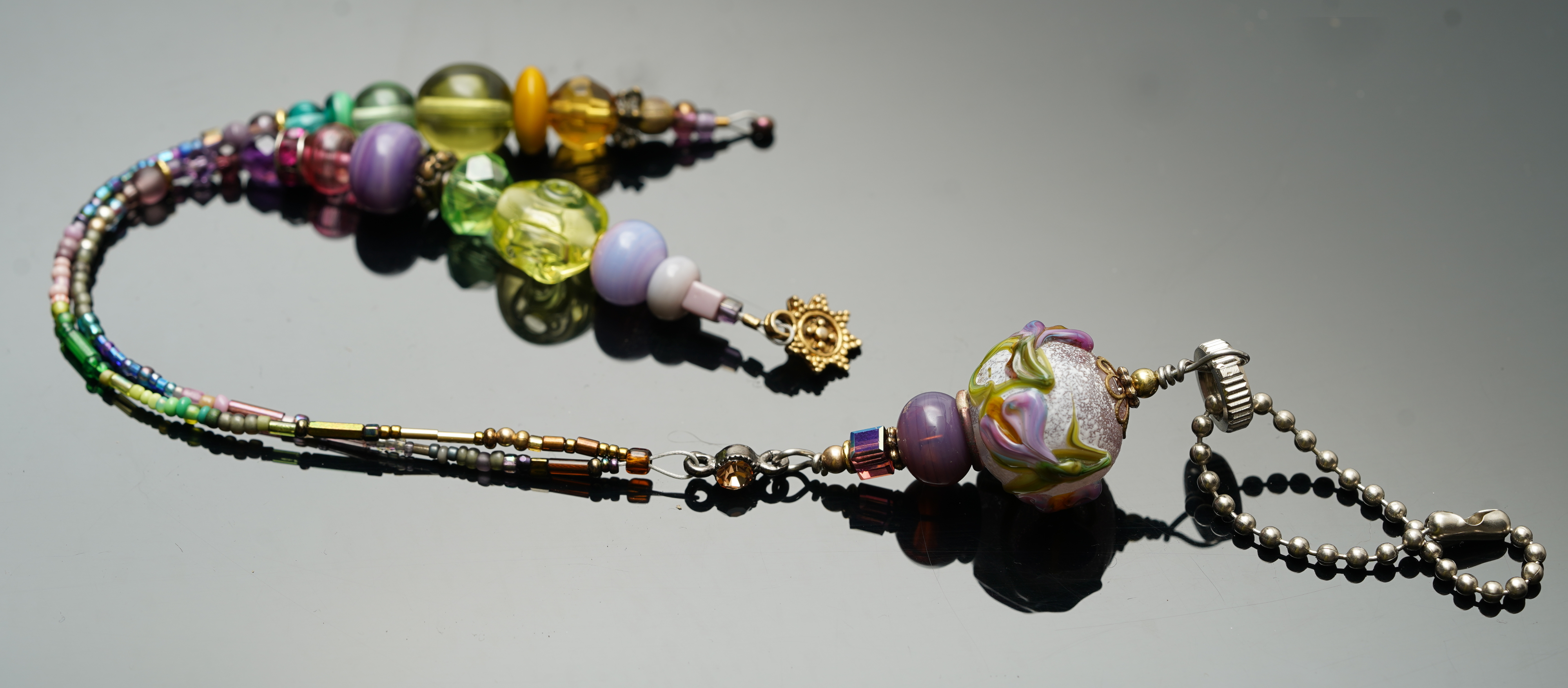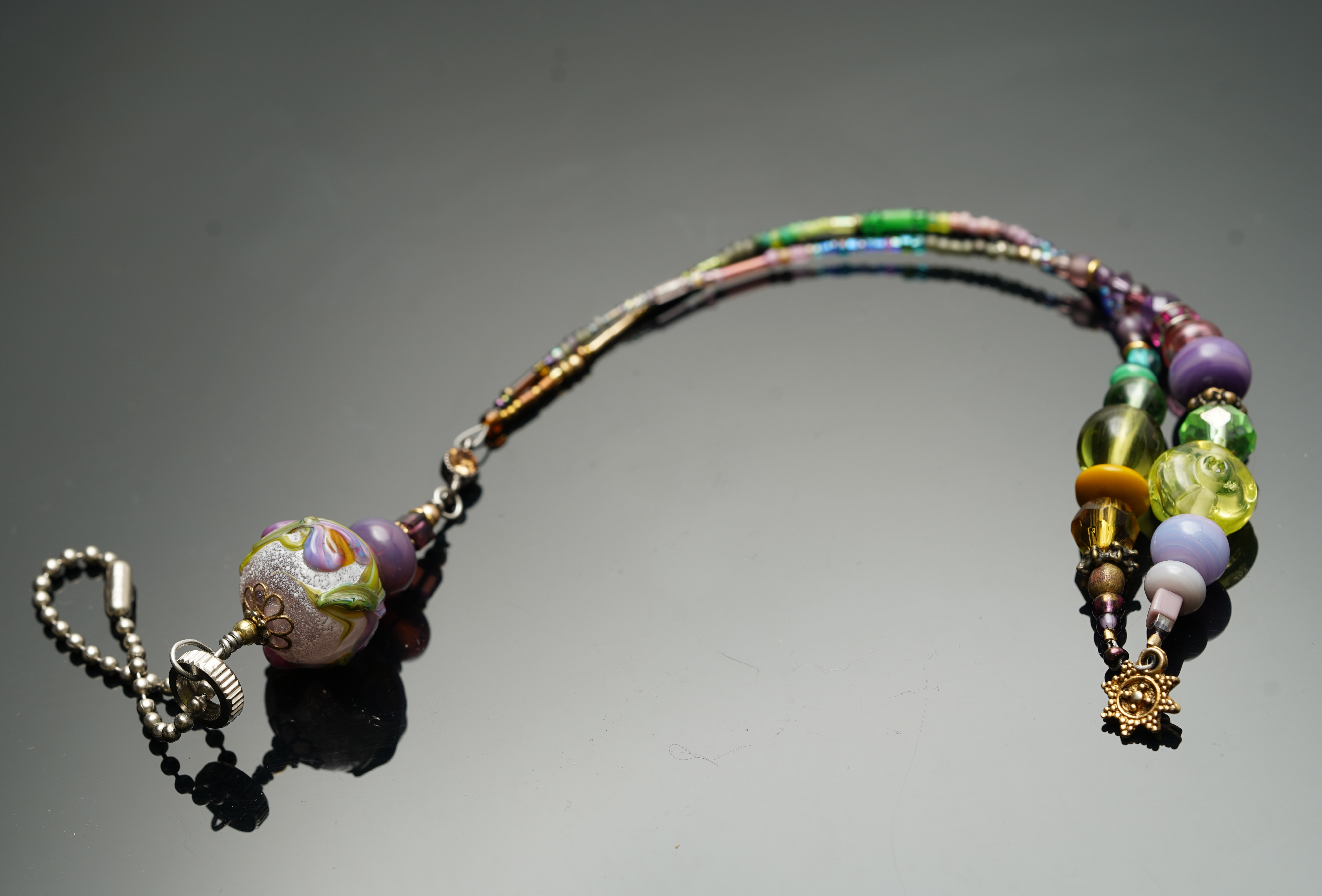 Dead mouse featuring floral trailing with thompson enamel background, roughly 17x19mm; assorted hollow stripeys, czech, chinese, and swarovski crystals; seed beads; malachite; base metal. Strung on beadalon with 316 stainless wirewrap, bicycle presta valve ring, length overall approximately 9-5/8". one plus phone camera, 12apr2022:10:56; f/1.7, 1/100s, ISO 200