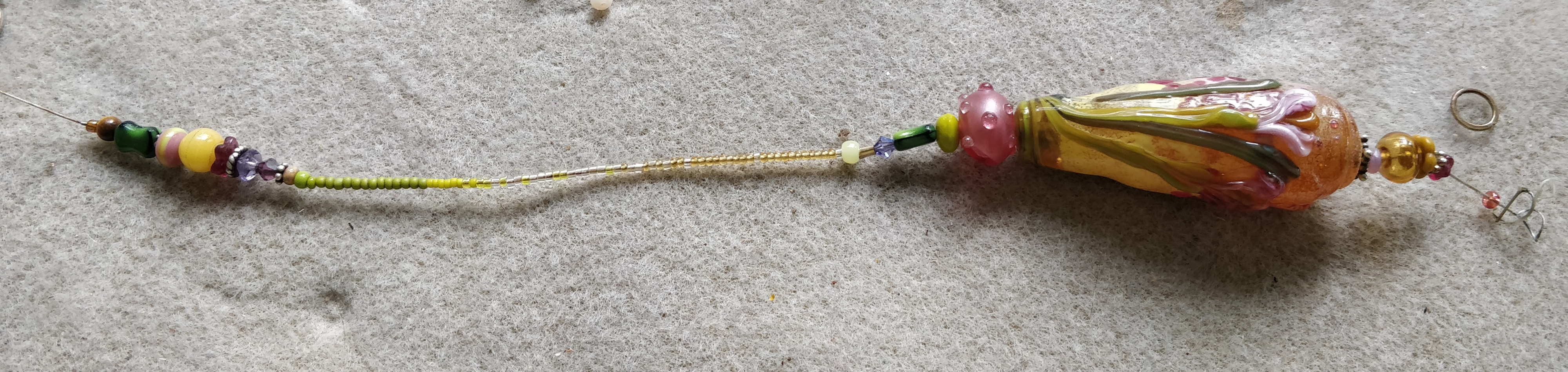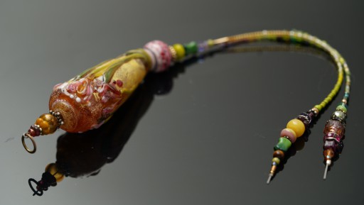 The pink abstract just below the vessel is just a touch larger than I would normally choose, but I wanted it because Fran made it for me:) I used some “luscious” beads in the second tail—fuchsia cubes, for example. This is after a very special mouse.
