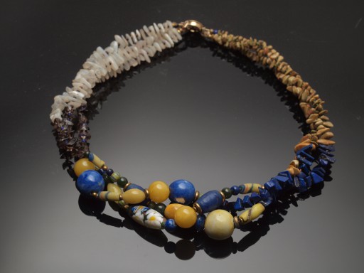 The design is not original: it was inspired by a gifted stringer who made a beautiful fwp, lapis and gold multistrand necklace as a commission for Priya Imports—if I ever locate their first 4 colour catalog, I'll show it. —My version is considerably less graceful, and though I like the graduated size of the picture jasper chips on the right side, which transition reasonably smoothly into the lapis, the moonstone to smokey quartz seems to me a bit clunky. Overall, it's not a great design, and I'd never now do that much work on the sides only to use such crappy beads in the center, such as the badly made thread-cutter opaline yellow lampwork ovals.