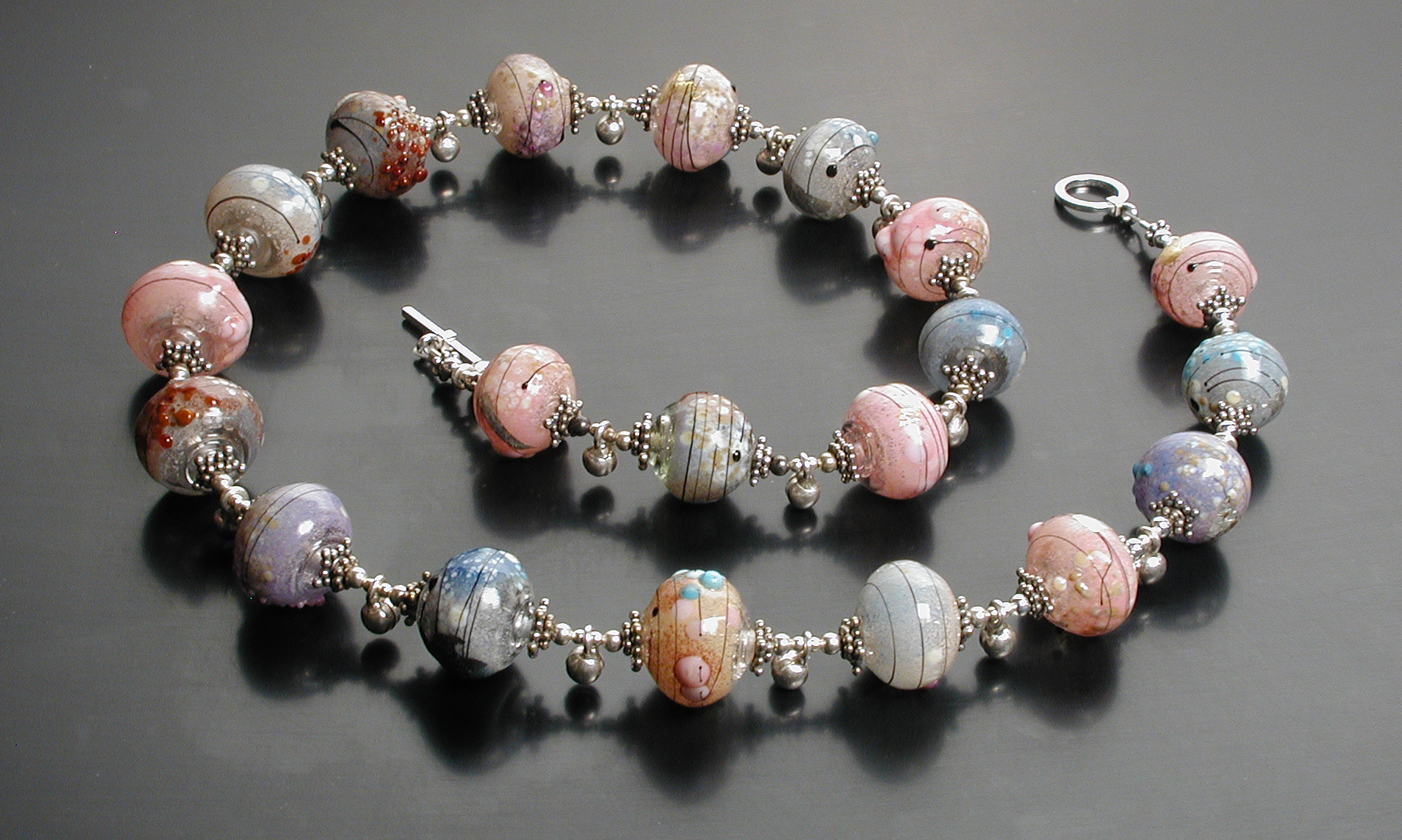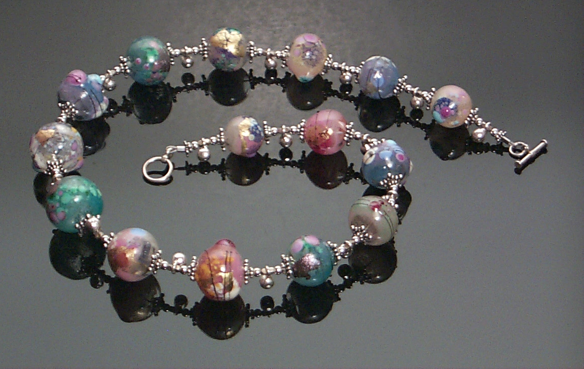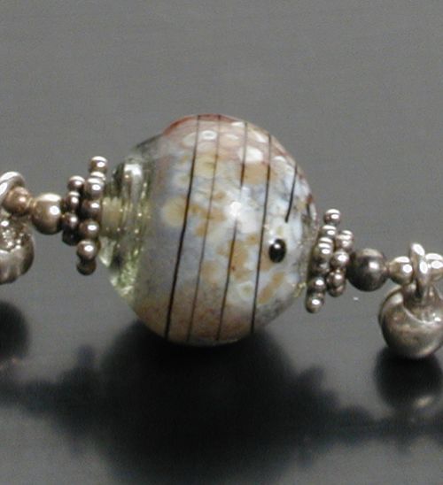 But I'm very happy with the design, and would like to do a series some day, perhaps with browns, ivories and blues. Hollow glass beads, decorated with thompson enamel, frits, precious metallic leaf and trailing; Balinese and US manufactured sterling components. On beadalon. Photographed with a Kodak DC260 (which is why the image is a little fuzzy). Private collection.