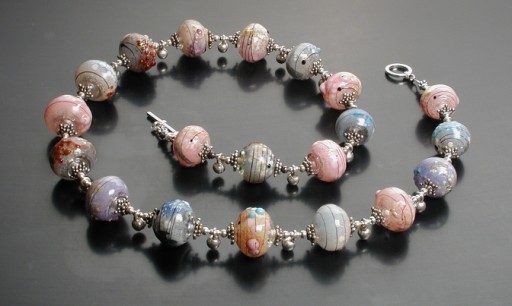 As I recall, I originally made this necklace for a gallery show held in conjunction with Gathering 2000—the first time I attended the (then) National Society of Glass Beadmakers’ annual conference. About the time I sold it, I concluded it would be interesting to do a second version featuring the browns, blues and ivories mentioned above.