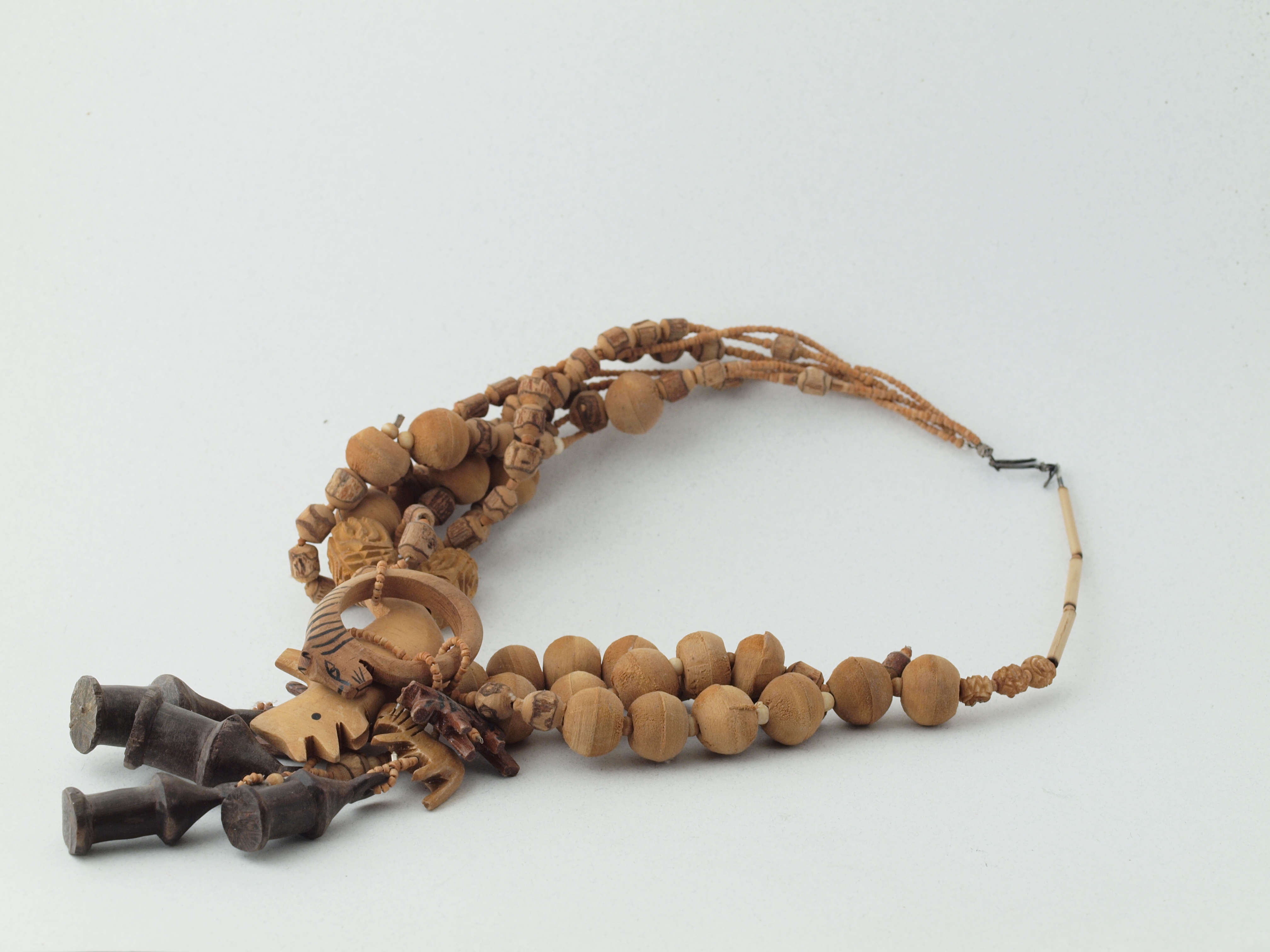 wooden multistrand necklace, featuring tiger, lion, rhino and hut beads made in Liberia. Length, 14", 19" opening, largest bead (rhino) 2.5" long; tigertail, sterling clasp. early 90s?