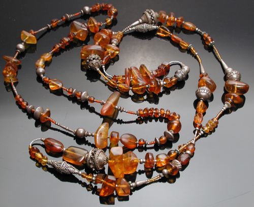 Two amber necklaces, the shorter of which is about 26” (I have a small head, so when I restrung it, I took out the clasp). L. Page Kaczynski, Sylvus Tarn. Early 90s. Collection of the artist.