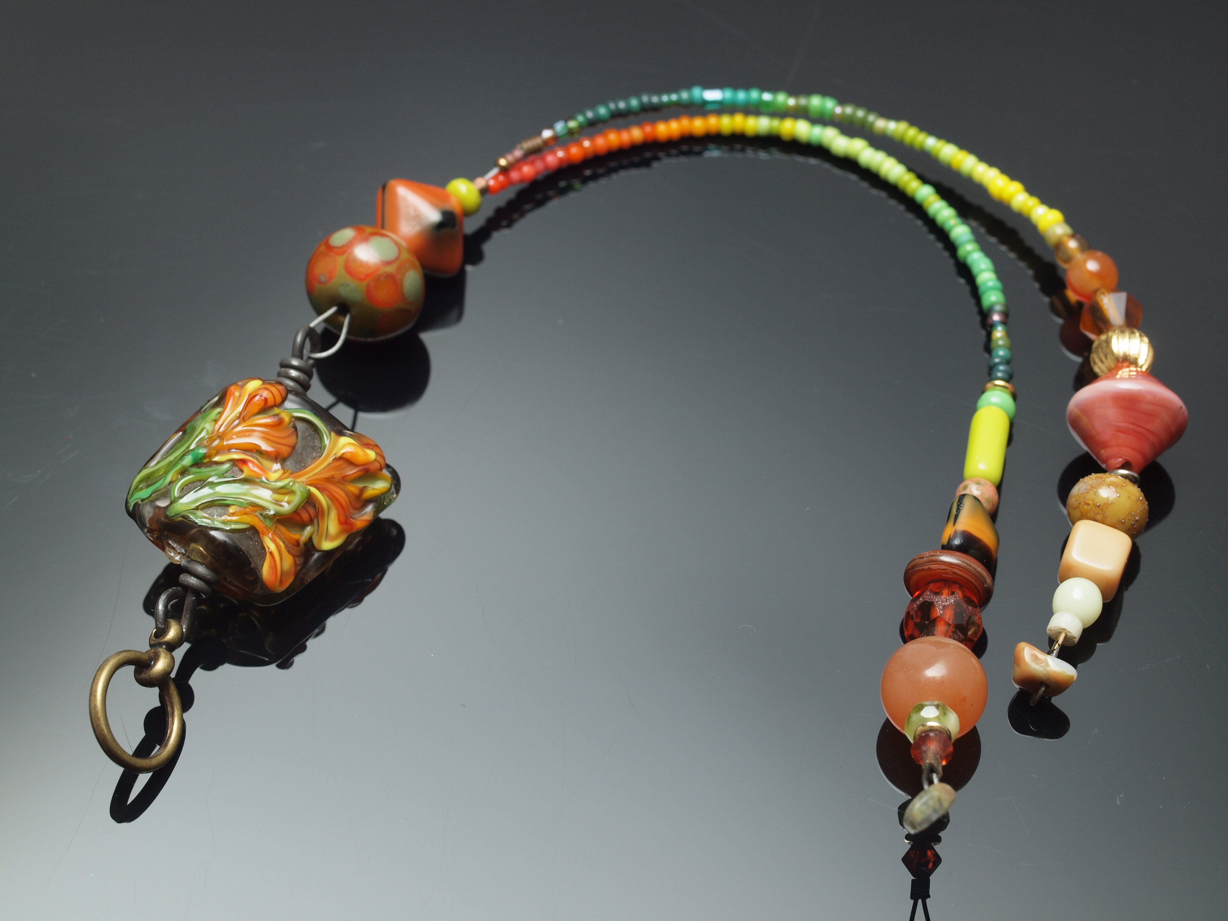 I decided I really didn't like the cutesy fruit dangle I used last time, and ended up sticking in rhyolite chips, as they were lying around. The left dangle is mostly unchanged from the first time I featured this mouse with the exception that I added a 4mm unakite round between the vintage orange & black faceted square and the lime green barrel. Also stuck the focal on a black iron wire this time. The small tan bead just below the coral bicone (above the cube, to the right) is actually cased in silver leaf, some of which turned to tiny metallic dots, the rest melted in for the colour. The olive and orange dot bead that replaced the coral hollow actually matches the colour scheme of the focal better, in my opinion.