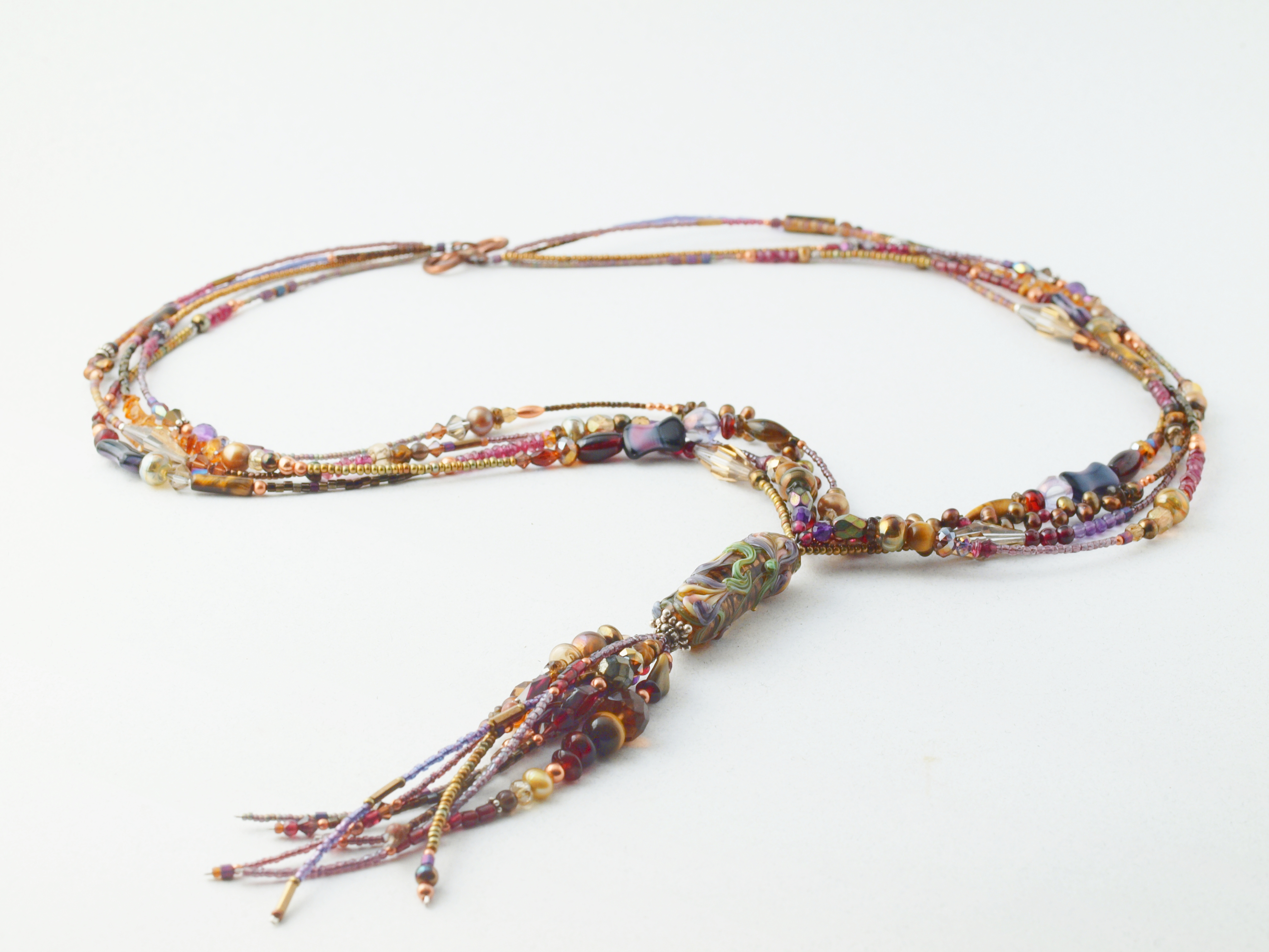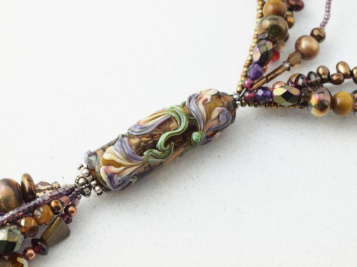 This piece includes a lot of older beads—semi-precious stone such as amethyst, citrine, garnet, and tigereye; vintage gold-lustered swarovski faceted barrels and purple, pink and black czech dogbones; and both copper and sterling metal accents. Lustered seed-beads and fancy dyed bronze pearls act to transition between the transparent glass and stone and opaque metal beads.