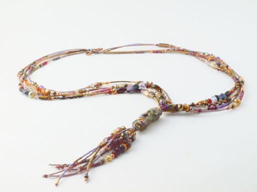 However, it's very much part of the multistrand tassel series—something that I've been messing with for the better part of a decade. It harkens back to the squid in its tassel construction and anticipates the color scheme, which I reprised, in this cream, gold and purple tassel necklace.