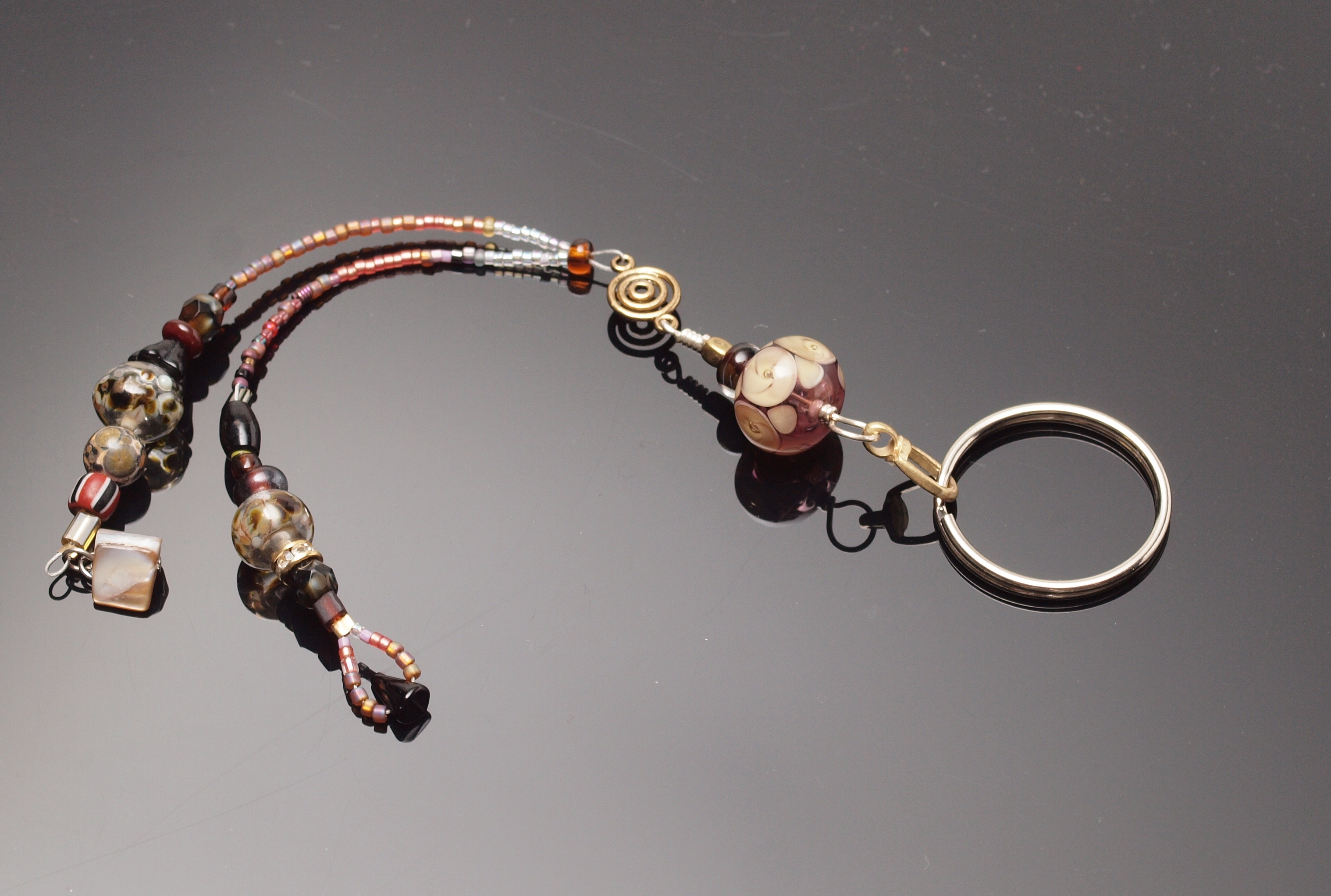Approximately 7.25 inches (not including keyring); focal is roughly 1/2 inch hole to hole. Effetre, boro, seed beads, basemetal, beadalon. Strung 2019, photographed 24oct2019.