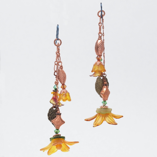 I shot these with flash, and played a bit with the curves tool, since I felt the highlights were a tad on the overexposed side. (I'm still getting used to the brighter monitor.) The wires the flowers are on are only 24ga, so that bottom dangle tends to bend, and required frequent straightening. Otherwise, however, I thought these made a quite decent pair of dressy Autumn earrings, as well a memento an enjoyable workshop, and the kindness of a fellow glassact member.