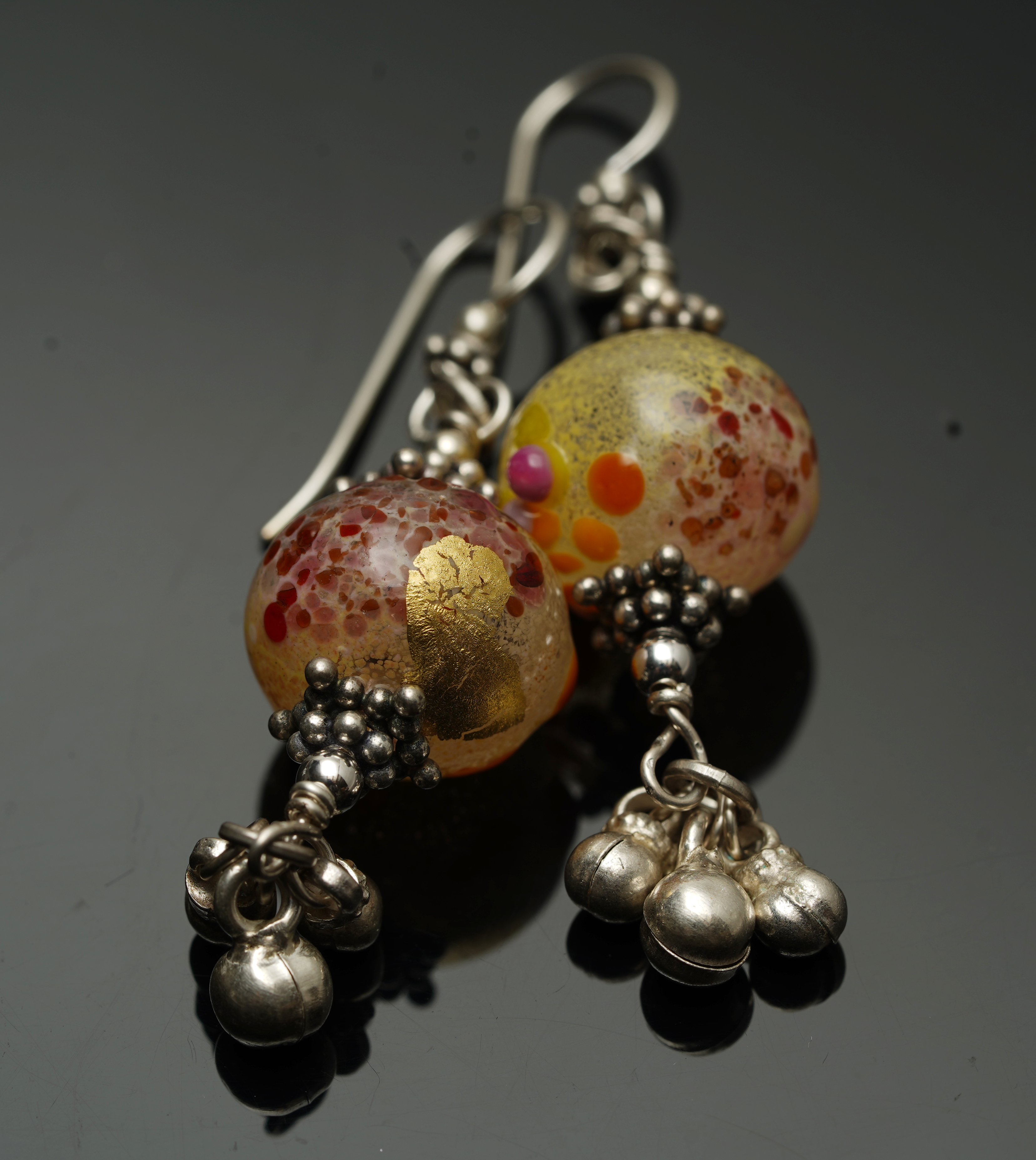 modern abstracts in a vintage style (effetre, thompson enamels, frits, gold leaf); sterling, bali silver, jun 2023. Photography: sony ILCE-7C, sony 90mm macro, f/8.0, ev -0.3, 1/60s, ISO 50, godox flash; cropped and slightly lightened in gimp, 16jul2023.