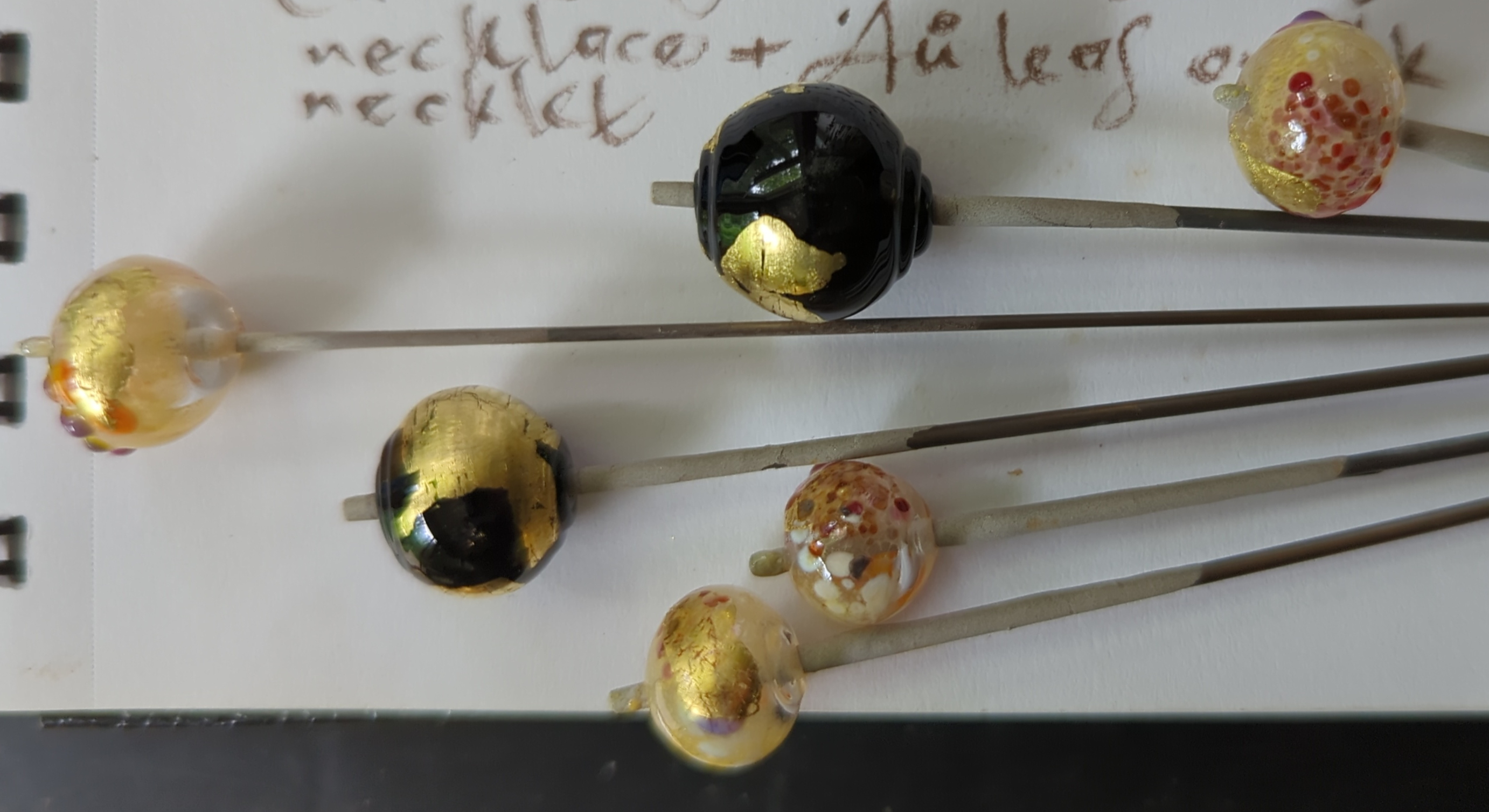 Bonus, they photographed a bit better lying down—my friend was willing to watch me make beads, but drew the line at another round of photographic futzing to try doing hanging versions of the images.[4]