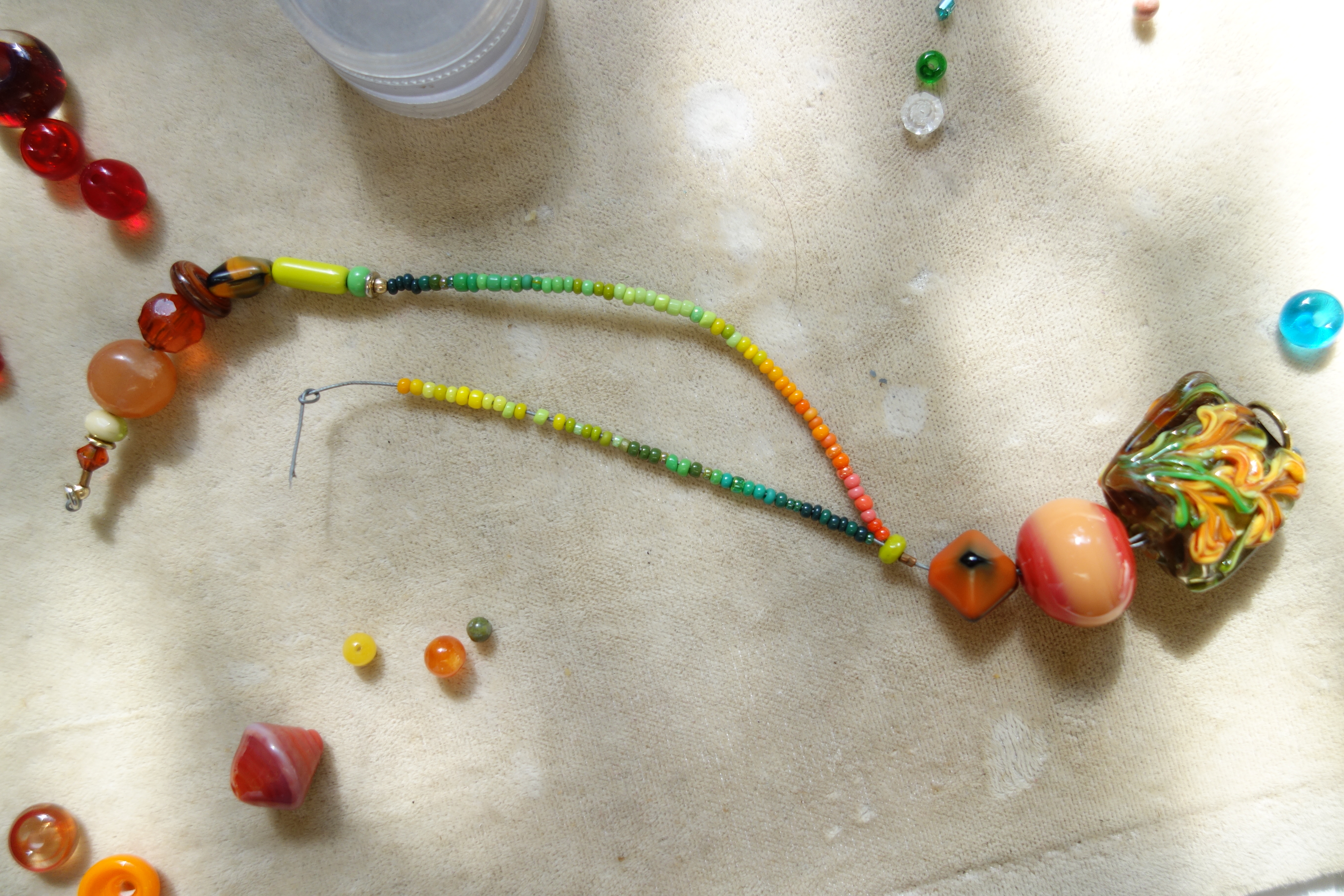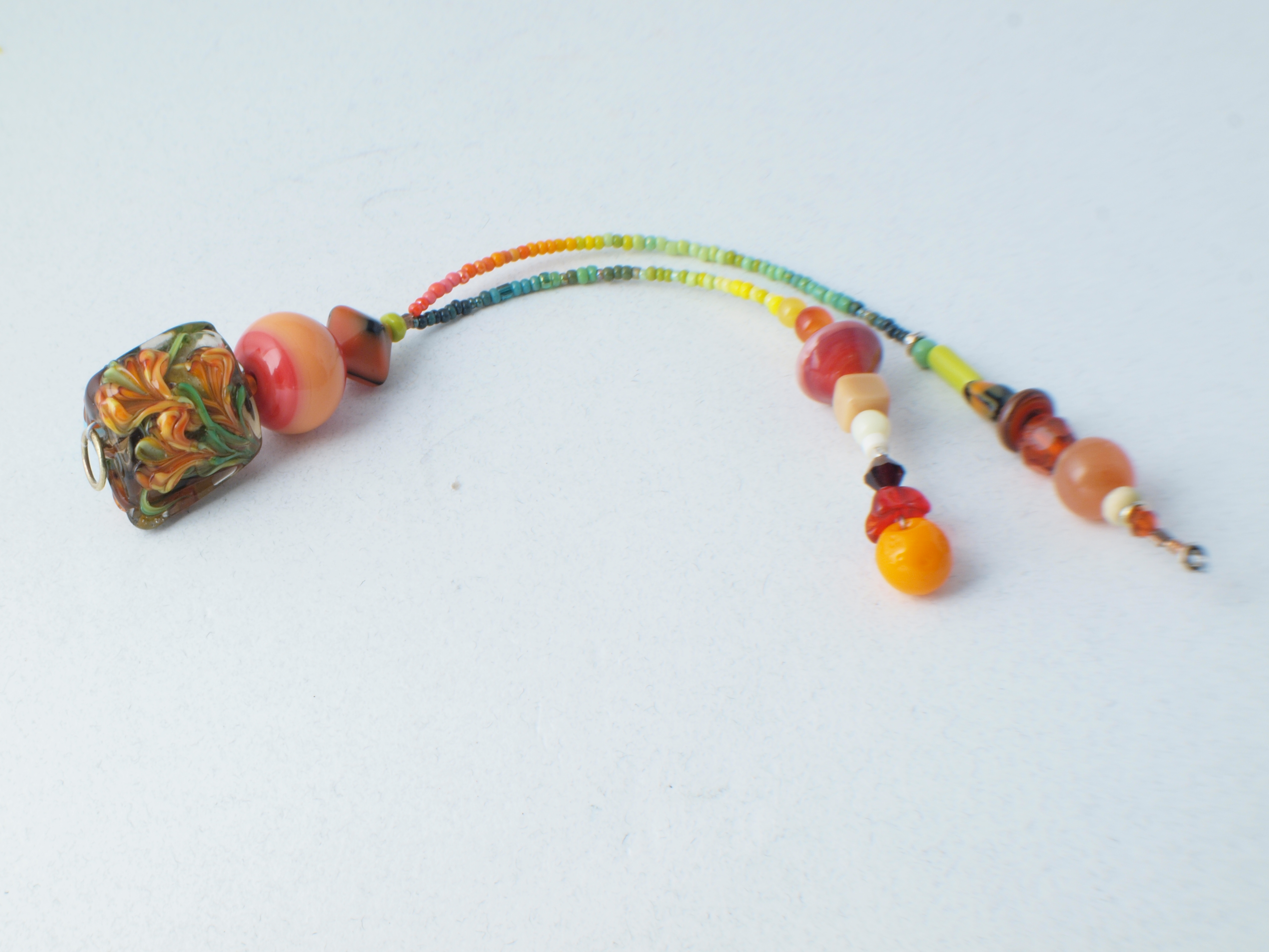 Though I did look up the older post to get a sense of what had been lost—about an inch of green seed beads and accent beads dominated by a 12mm chinese faceted round crystal—I didn't bother to replicate it. I had this fun off-center sort of fruit looking bead I decided to put on the end; also a bicone pressed lampwork bead, not particularly well made, but interesting because of the color shifts resulting from the temp differentials of using the press (probably multiple times) on it—I'm guessing the glass is CiM phoenix or similar.