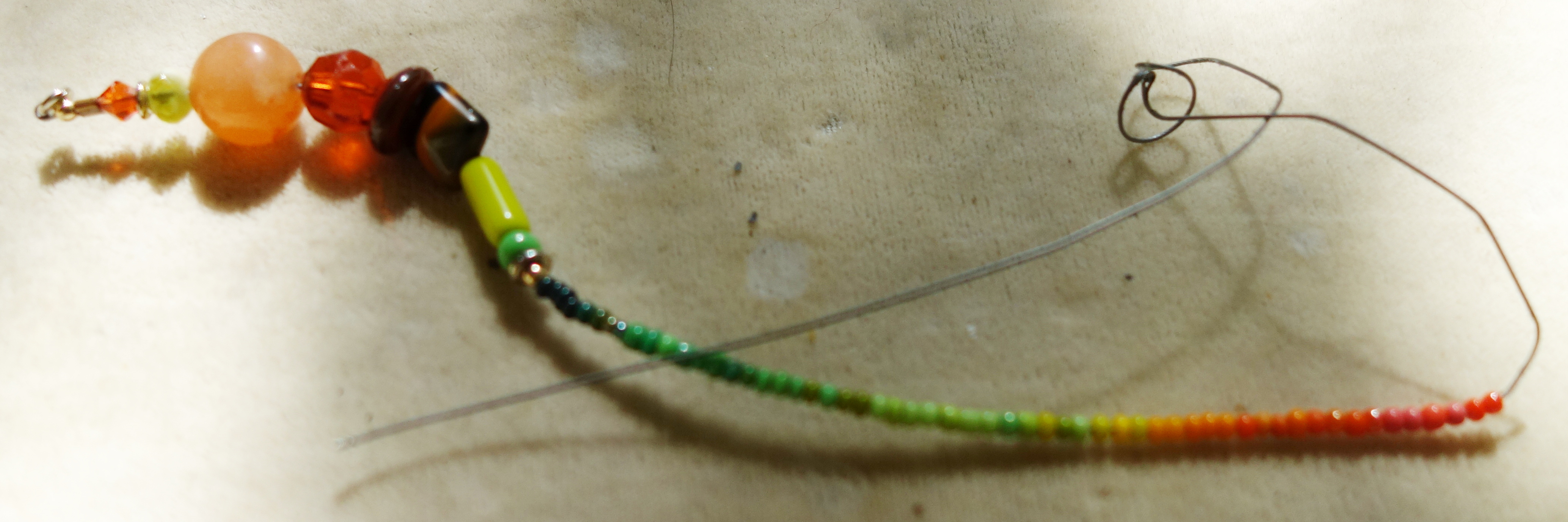 I have no idea how the client managed to twist up the tigertail in the middle of the beads, but it's certainly interesting to see the various kinks, desheathed cable, etc. Unfortunately I was lazy and shot this with the lensbaby, but I also pretty impressed by how ground the vertices of the facets on the orange faceted bead have become, from wear: usually I don't see that much even on vintage crystals! This is something that got a lot of hard use, and I'm very pleased it lasted so long—well over the year that I typically warranty things.