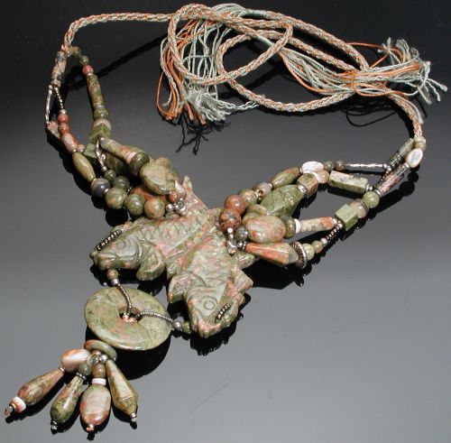 The body of the necklace is 8 inches long; the silk cords (not including tassels) are approximately 9 and a half inches long each, for a total length of about 27 inches, with 3 inches of fringe additonal on the ends. The accent is about 2 inches at its widest point. Unakite, abalone, sterling silver, cut steel, silk.
