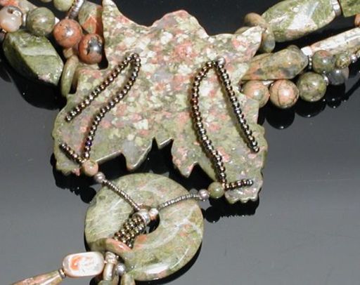 There is a whole range of interesting stone that comes in what I call the bronze/green/brown sequence, and mentally think of as “sun & dappled shade upon leaf, limb and earth.” Rhyolite, or rainforest jasper, tops my list, but unakite, olive green with salmon (orangey pink, to those of you not into the fancy naming conventions) flecks, definitely belongs in this category.