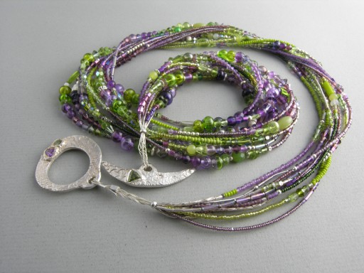multistrand necklace with lots and lots of mini-hollows, plus of course many other little glass beads; tiny amethyst and peridot (also jade); strung on silver coated beadalon. Features a stone-set pmc clasp.
