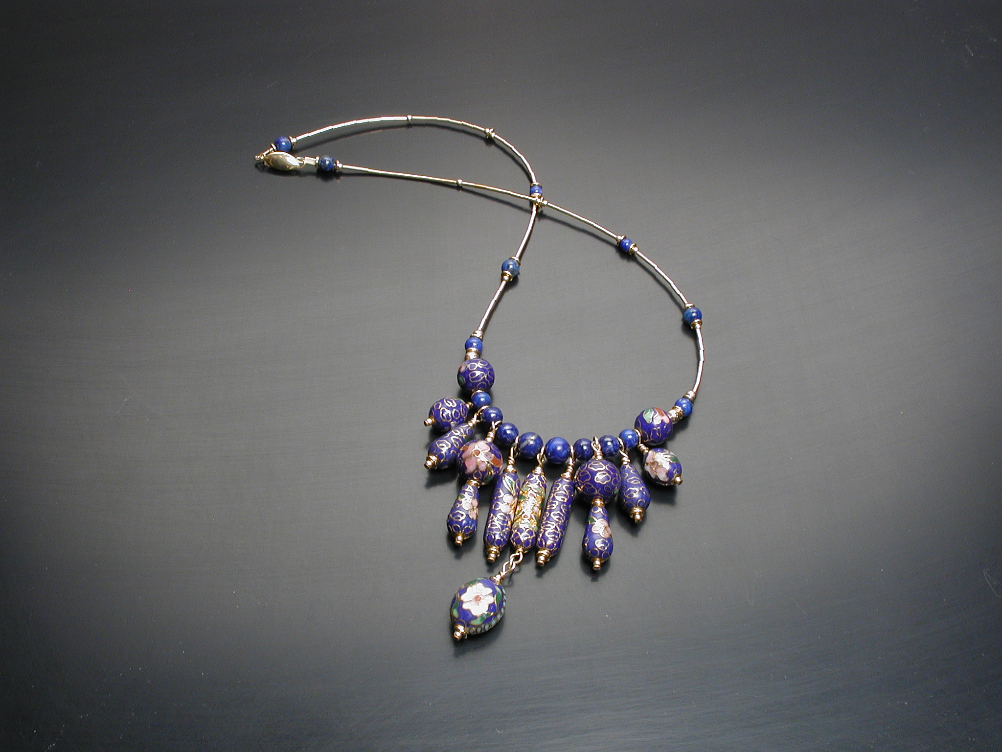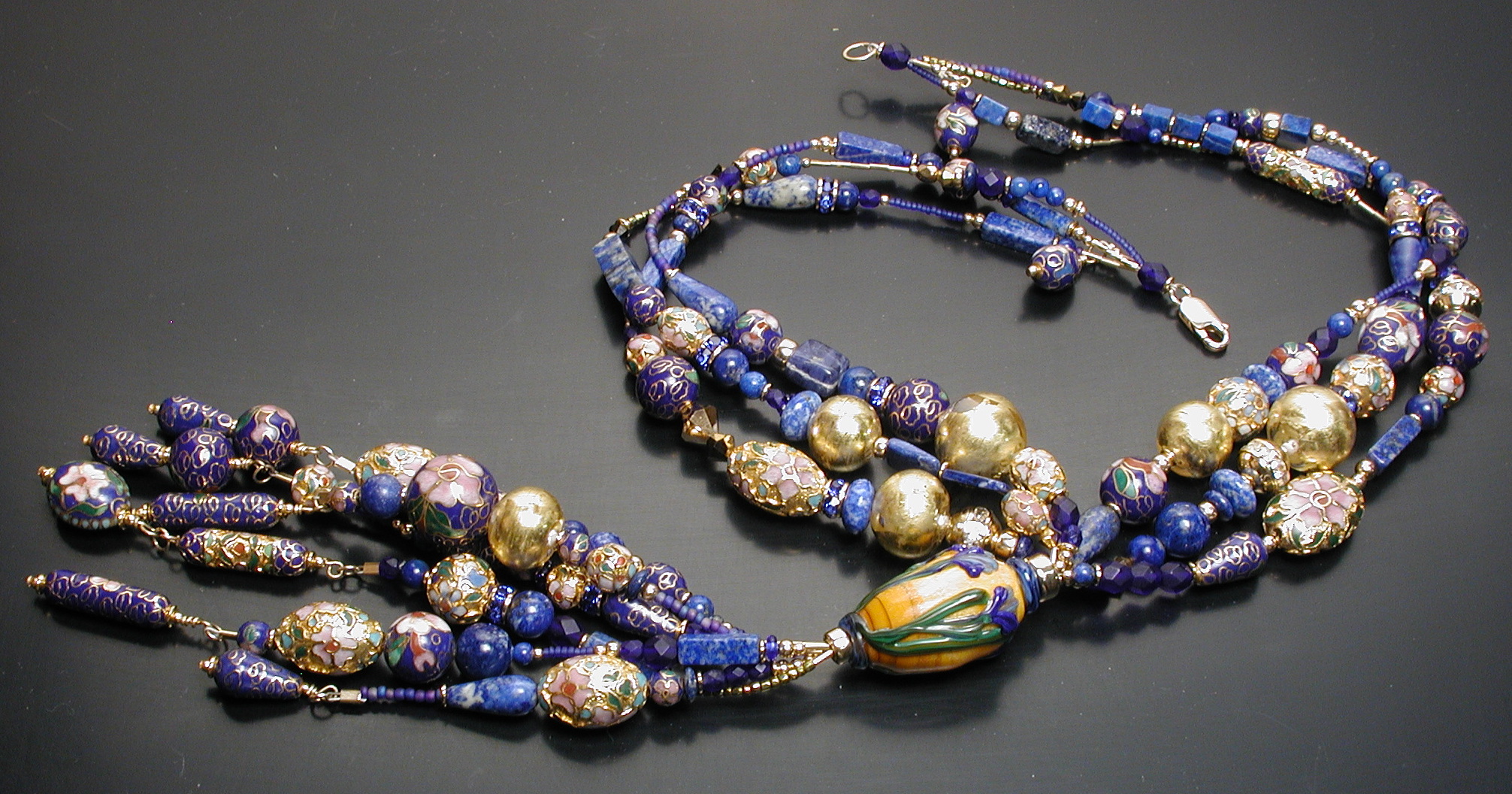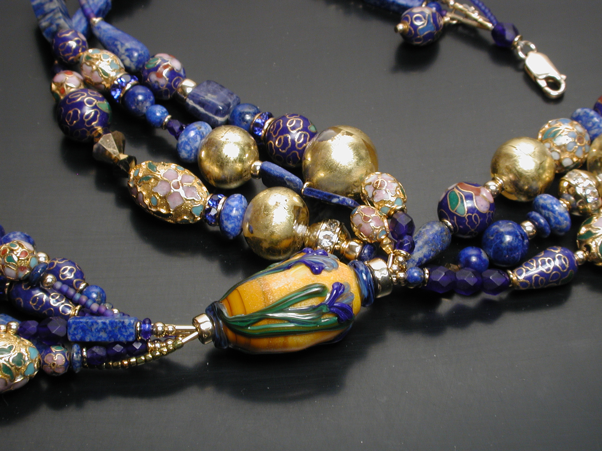 So she asked me to make something with it, and I went to town with this large and dramatic lapis lazuli and cloisonne multi-strand necklace, featuring a yellow and blue floral vessel.