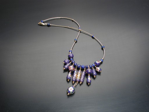 Lapis, cloisonne, goldleaf lampwork; accented with frit and powder floral. Photographed 19dec02, so I'm sorry to say there are some very bad specular highlights.