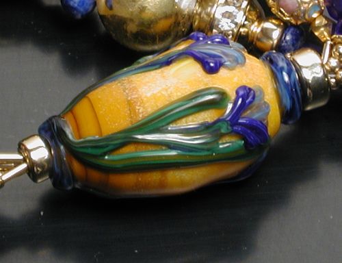 So I made a floral vase bead on bright yellow glass, cut the old necklace apart and restrung it into the monstronsit—I mean big and bold necklace below: