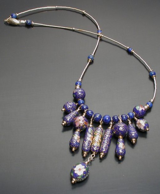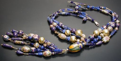 Since my sister isn't shy about giving things back if they break, I felt free to use components that are a tad on the fragile side, such as rhinestone set beads. To keep the gaud factor from going completely over the top I used relatively simple gold-filled beads, since the piece has a variety of lapis shapes, colored rhinestone rondells, lots of cloisonne, and even champleve beads. The original dangles are preserved in the tassel. No point in wasting all that perfectly good gallery wrapping.