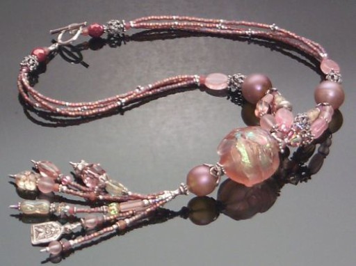 However, I doubt anyone who didn't know our work well could differentiate, and that's as it should be: we strung these sitting side by side, together. This piece appears to be almost entirely glass beads. It would've been strung from the dangles up, and the seed bead portion and area by the clasp was actually done by someone else. Photographed with a DC260 (hence the fuzzyness). Private collection.
