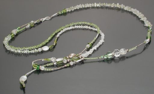 Peridot, quartz, moonstone, glass, silver. 23” long (from nape to central dangle); spacerbar 15/16” high x 13/16” wide. Early 90s?