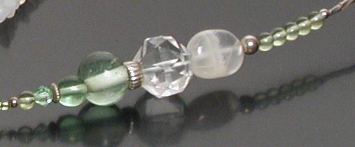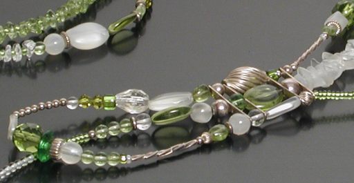 This little section of faceted quartz, peridot, and Indian glass illustrates the rhythms I like to employ when putting various sizes of round beads together. The corrugated rondel in the center, acting as sort of a collar, or constriction, in the pattern, is a trick I picked up from Page, who's used it to great effect.