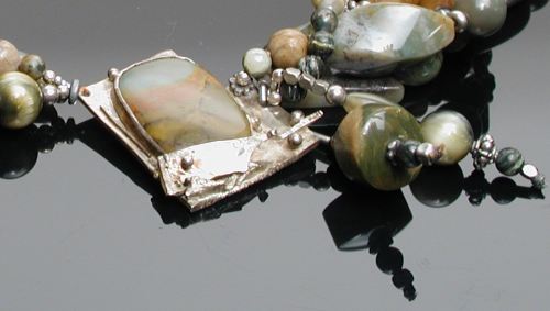 Like the Austin Necklace (another geographically named piece, and Unakite Double Fish Necklace this is one of several pieces in which the beads actually are strung on silk later braided onto the ends. It's time consuming and difficult, but philosophically pleasing.