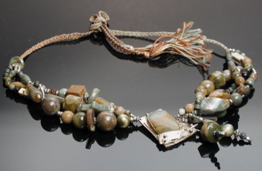 I alluded in the tourmaline necklace page that the many-colored but primarily green tourmaline is my favorite transparent stone. Rhyolite, or Rainforest Jasper, is my favorite Opaque stone. The braid used to finish this necklace is a flat Peruvian one. Put the two components together and you get ‘Peruvian Rainforest’. Lucky for me, the Amazon Jungle, or at least parts of it, are indeed located in Peru, so quite by coincidence I was able to combine the elements in a geographically correct way.