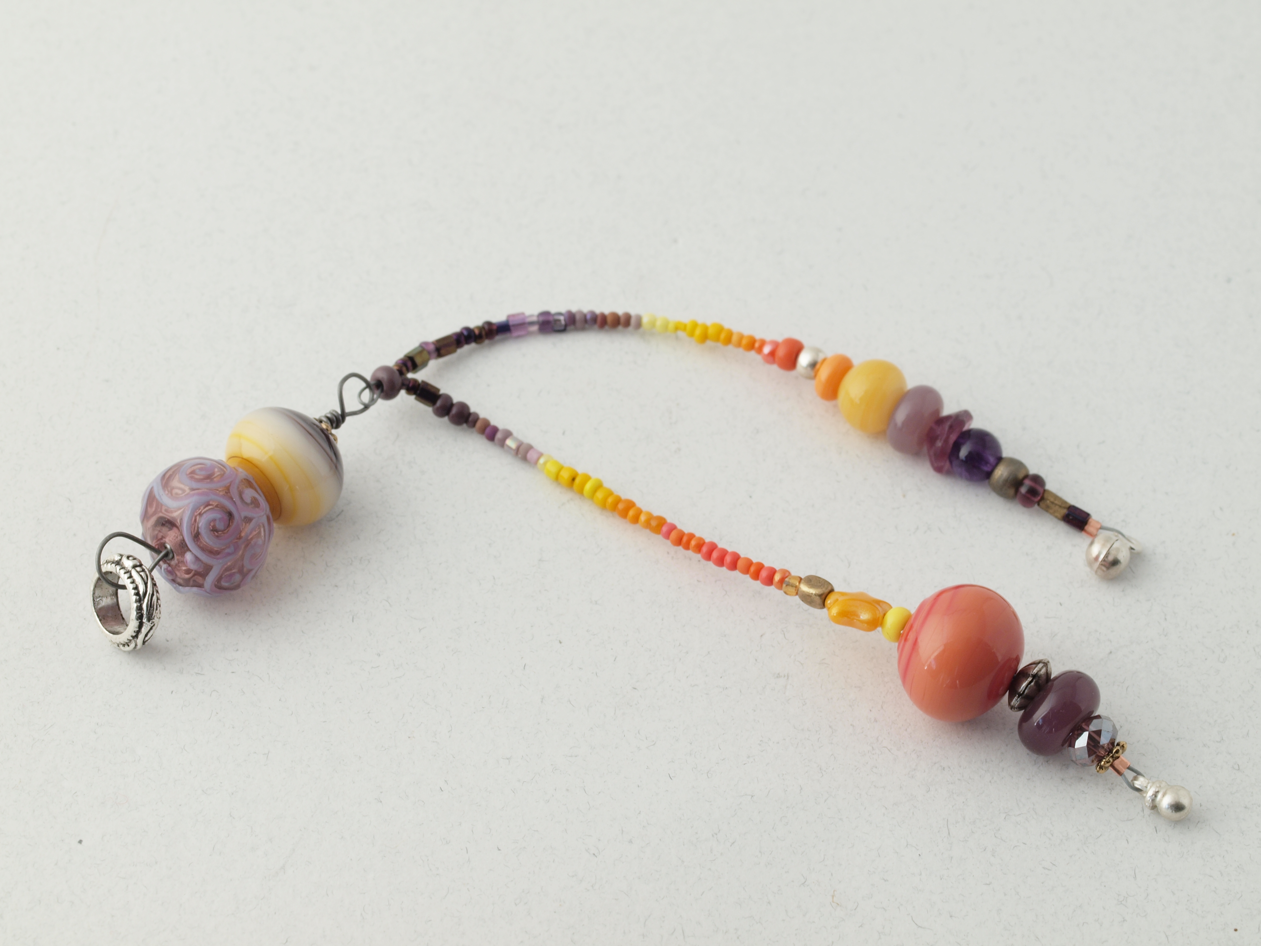 Dead mouse. Pewter ring, memory wire, 49strand beadalon; glass, amethyst, mixed metals, sterling[2] gungroo bells. 6.5”, constructed 18nov12