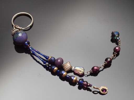 glass, assorted mixed metals, beadalon. Focal, made with reactive (e.g. silver green or the like) fine frit (possibly over thompson enamel), about 15mm; Length approximately 7.5" (to longest tail) not including keyring. Photographed 30oct2019. ISO 200, f8 1/125sec, manual flash, custom white balance.