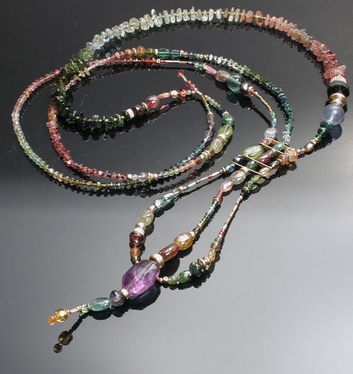 The shorter necklace is more idiosyncratic, as I ever only made one of this type: this one. When I'm in a really gaudy mood, I wear them together, as the shorter nests inside the longer. Note that both pieces have many graduated sections, especially of chips. Tourmaline, like any multi-colored stone, is challanging and fun to graduate because its chips must be sorted not only for size and shape, but color as well.