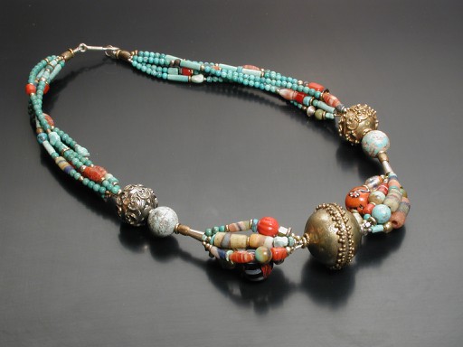 The beads used in this necklace were likely lying around, perhaps samples set aside so that I could draw them. (One of the most exquisite ink drawings I ever did was of a chinese turquoise pendant. I'll have to dig it up someday.) The turquoise, glass—cheap Indian or crude African sand-cast—was similarly inexpensive. I particularly like the way the brightly colored glass strands “puff” on either side of the central focal point.