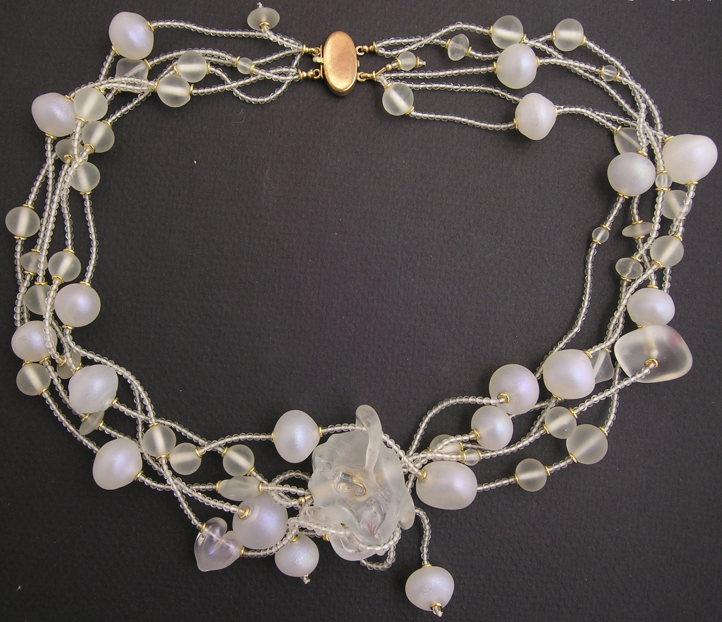 Necklace, early 2000s? Thread (probably nylon), gold fill and gold plate, frosted glass, quartz, lampwork. The focal was double strung, that is, the thread inside the large bead was strung with liquid gold, to position the beads, protect the thread and give a bit of interior gleam.