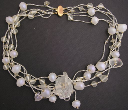 As a fad, the pearls floating in space was short-lived, and my viceral reaction to gluing beads—even the cheapest of freshwater pearls—thereby rendering them no longer beads, and thus, single-use—was such that I was relieved. But I was intrigued by the textural aspects of beads “floating” on thread, and attempted something similar with this piece, achieving the contrast by using colorless 2mm quartz (of which I had a great deal) with frosted glass and iridescent pixie-dust coated lampwork hollows.