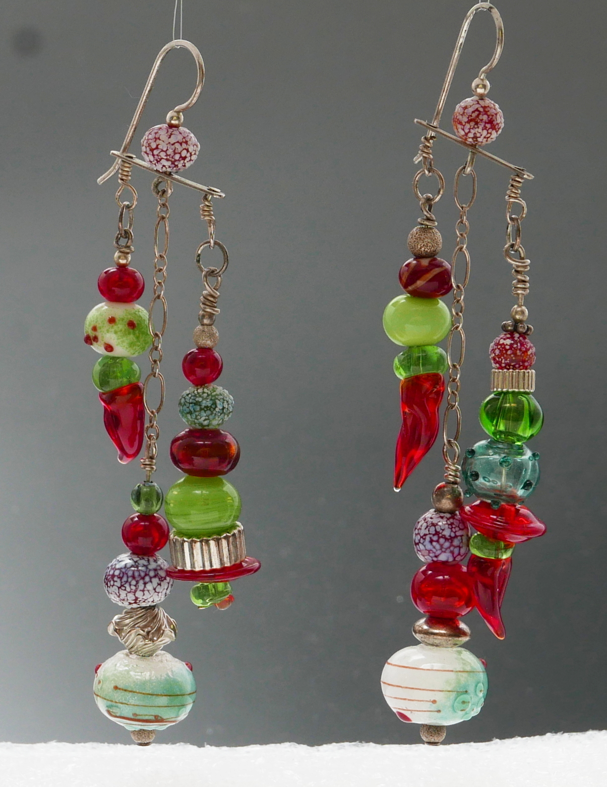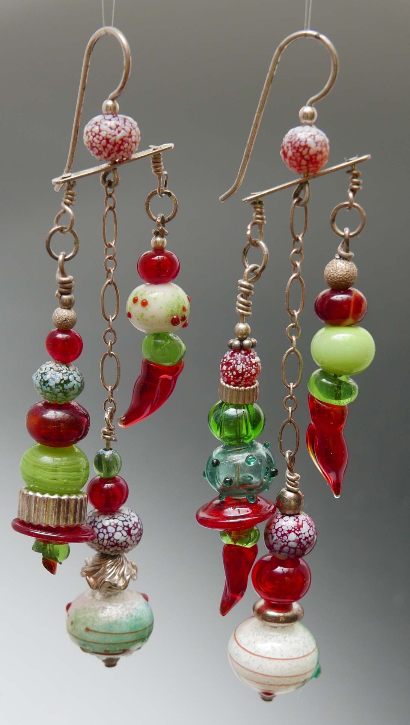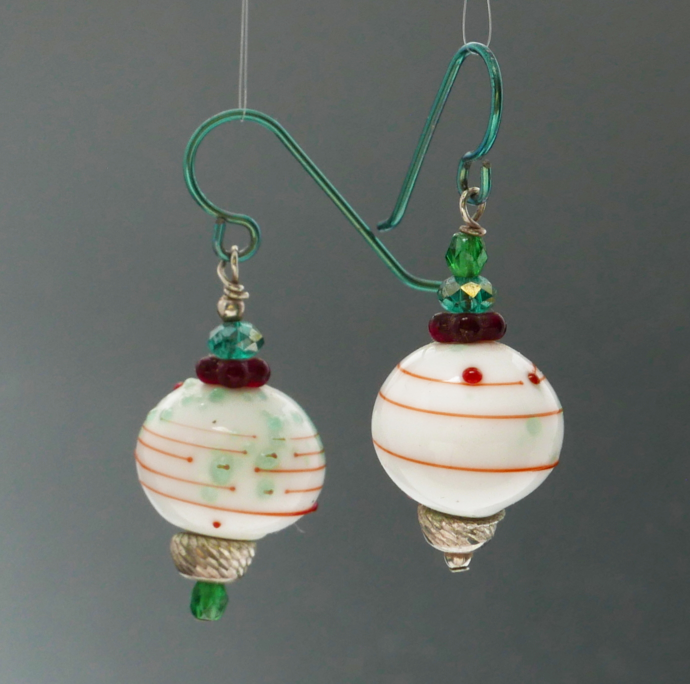 holiday earrings, 2012 (I assume) Note the reversal of the top and bottom beads of the dangle. lampwork, with transparent thompson enamel, trailing, czech prssed beads, sterling silver, niobium findings.