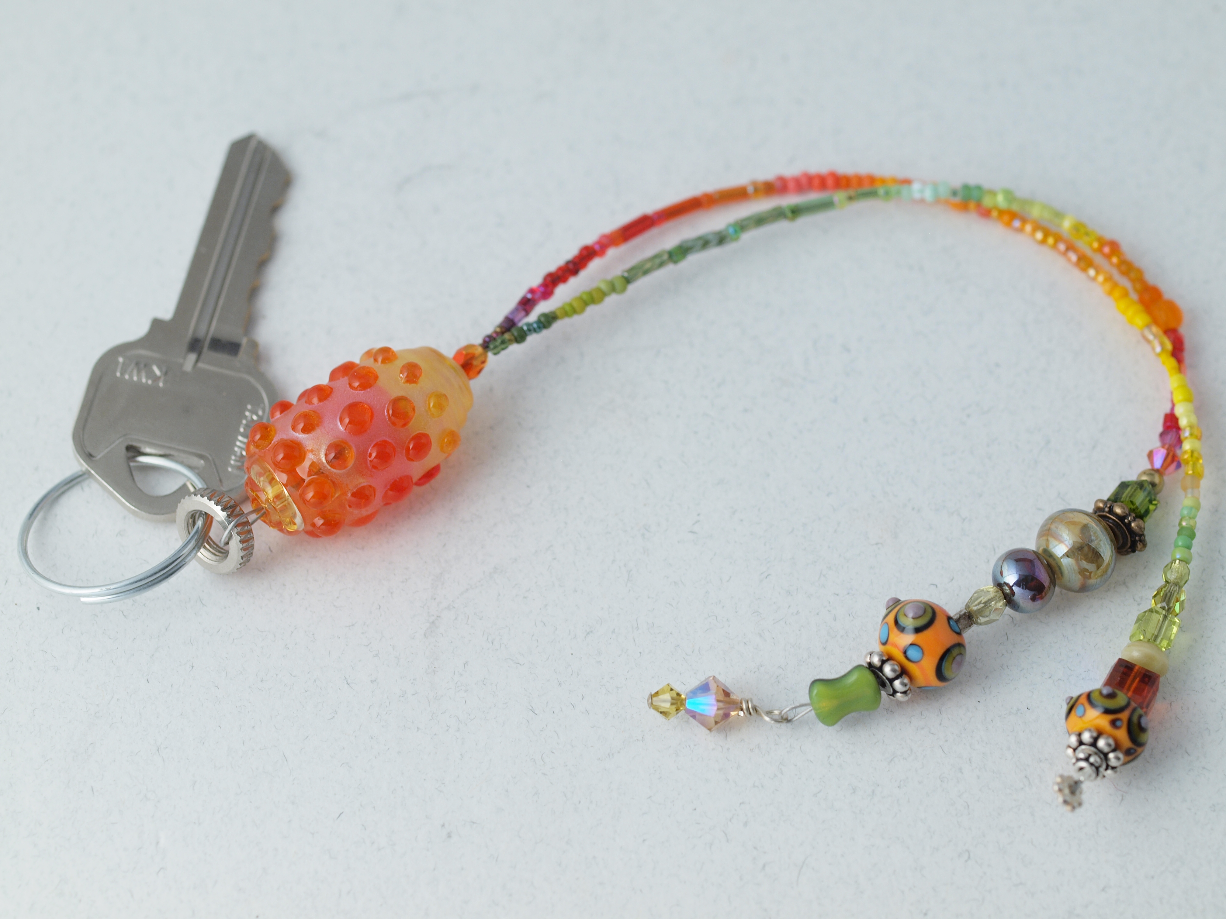 This one features one of those serendipitous beads made while fooling around. I quite like the way the yellow and orange transparent glass blends under the pixie dust, so instead using it for an ongoing orange bead curtain strand project, I set aside to serve as a mouse—that way it can keep inspiring me to explore this concept:)