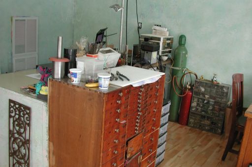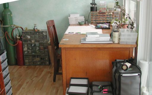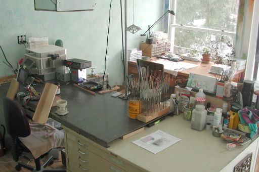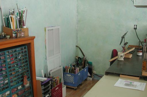 view of the studio from the door, showing map cases, steel table, torch, arm rests, and kiln. Almost cropped out is the ventilation shaft; behind the flameworking table is the stringing desk.