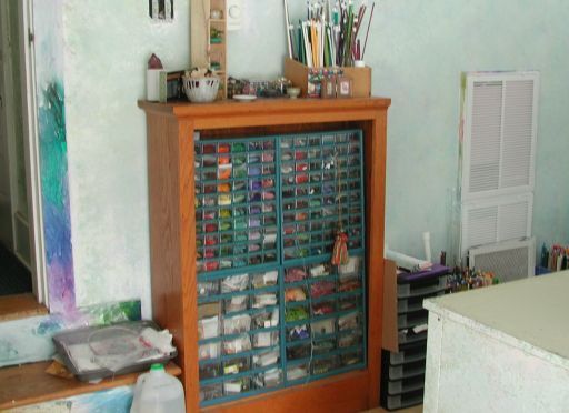 This oak bookcase was originally a builtin for the wizard's grandmother. Lucky for me, it's just the right size to hold my ‘blue case’ storage, including a lot of seed beads and findings. On top is my satake rod, in a very pretty wooden box the wizard built out of scrap. Some day, after I get rid of the satake, I want to put all my stringer and twisties into it.