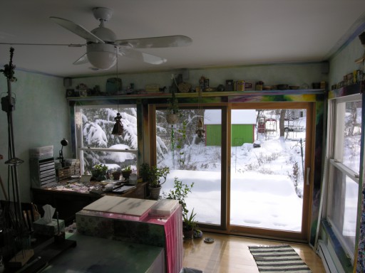 I often try to tidy up the studio about this time of year. It's my way of celebrating St Patty's (since green beer does nothing for me, but the studio is certainly green) or perhaps spring (also harbinger of green;). As the weather warms up, it just seems to me that having a nice, tidy studio helps to naturally encourage new projects, to go along with the new growth outside.