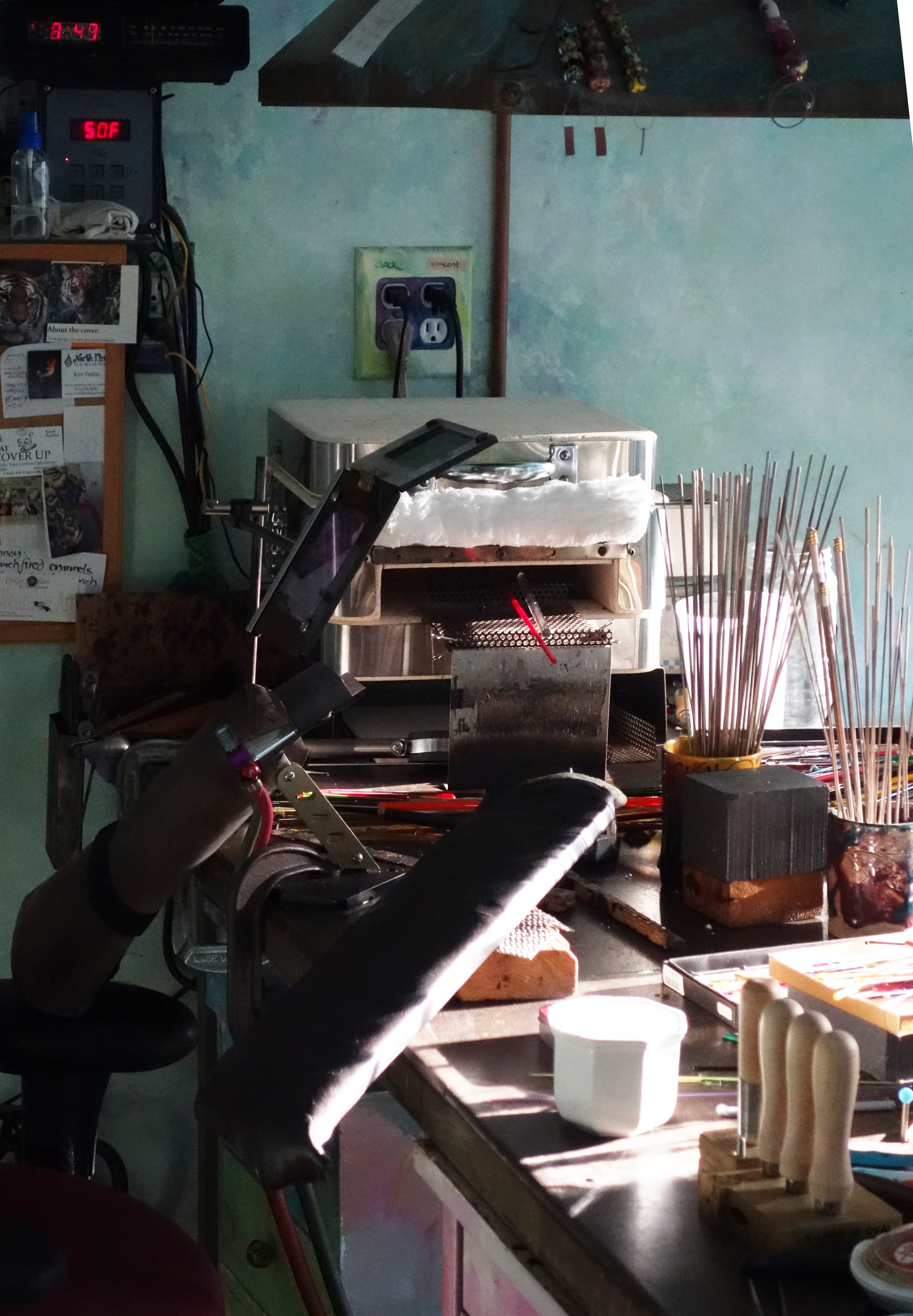 I was interested in the way the light caught the translucent red rod stuck into the kiln rather than capturing how messy it was; but you can see the piles of rods, the cardboard trays of stringers, the fact that several presses are sitting out. (And the stringing desk is considerably worse.)
